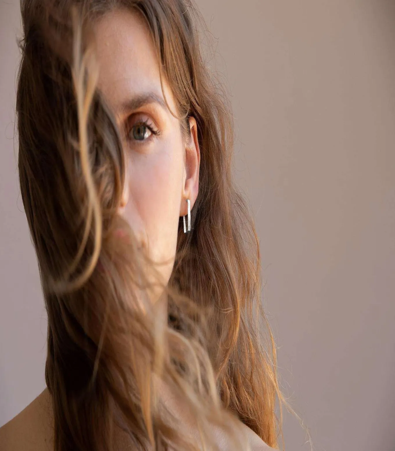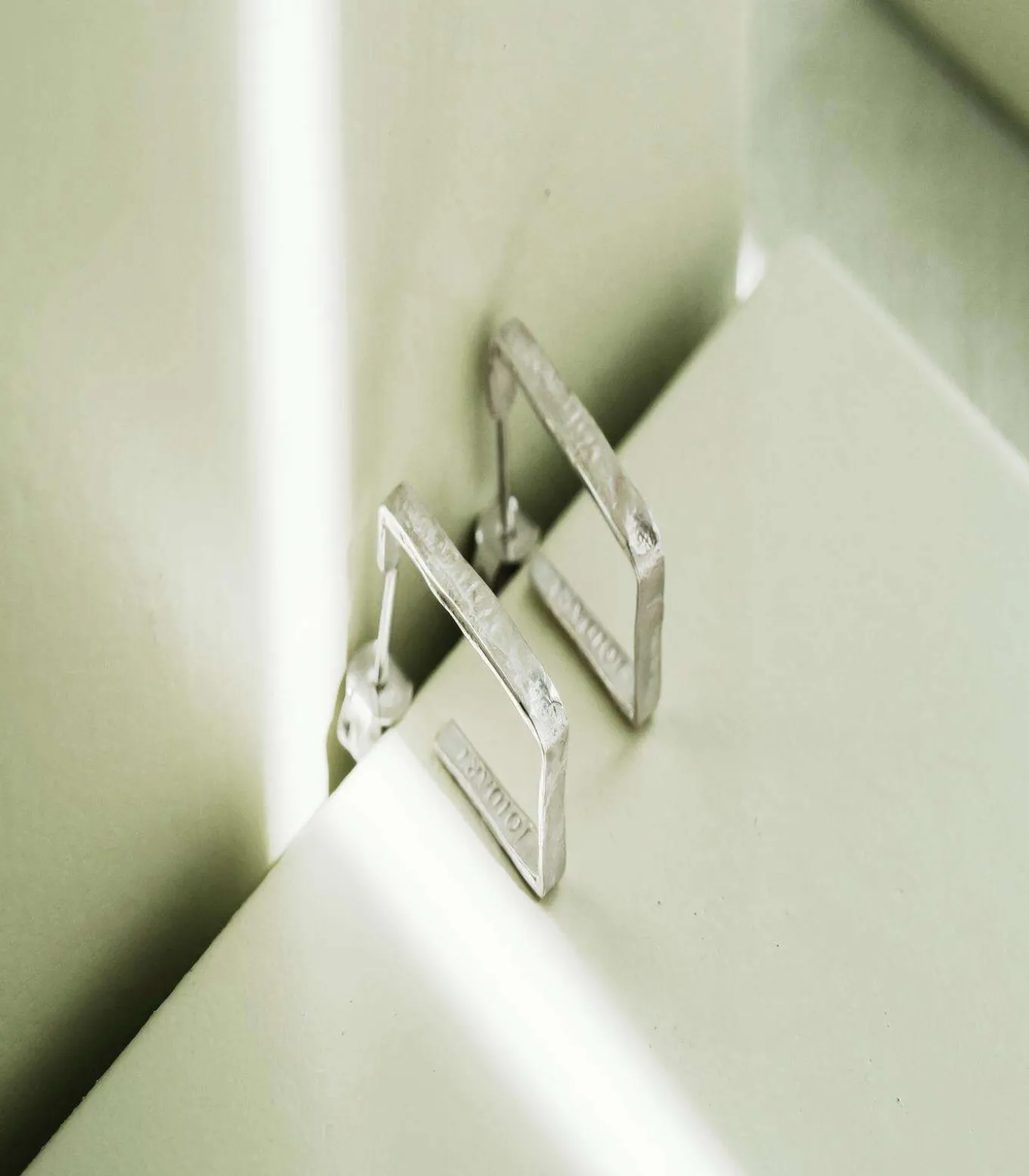 Middelgrote, rechthoekige oorbellen van mat glanzend 925 zilver met een platina coating. Smal ontwerp met texturen die doen denken aan de schors van sommige mediterrane bomen. Vlindersluiting.