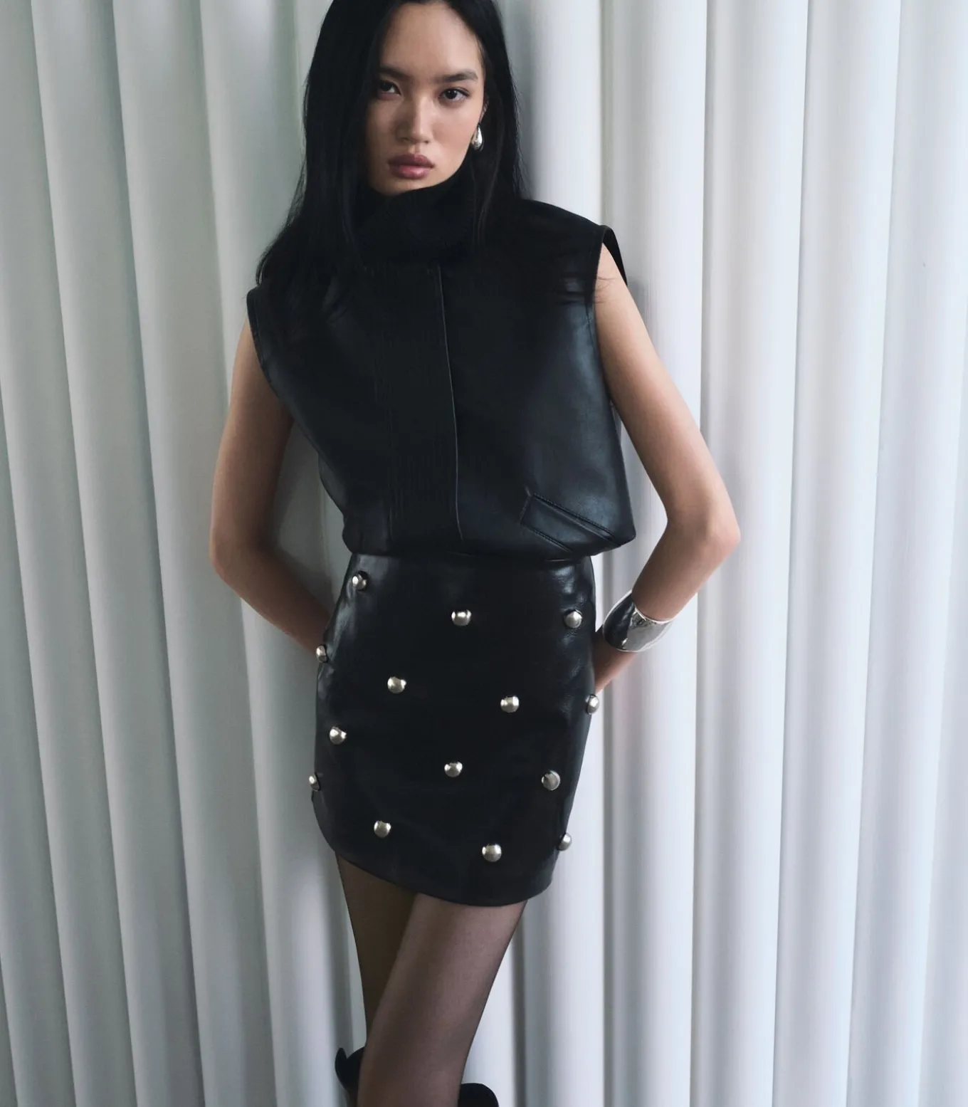 Deze mini–rok van kunstleer voegt een moderne en gedurfde uitstraling toe aan je garderobe. De metallic studs zorgen voor een eigentijds detail dat opvalt. De standaard taille biedt een comfortabele pasvorm geschikt voor diverse gelegenheden. Perfect te combineren met een blouse en hakken voor een chique look, of met sneakers en een t–shirt voor een casual uitstraling. Een veelzijdig stuk dat je moeiteloos kunt stylen voor werk, vrije tijd of een avondje uit.