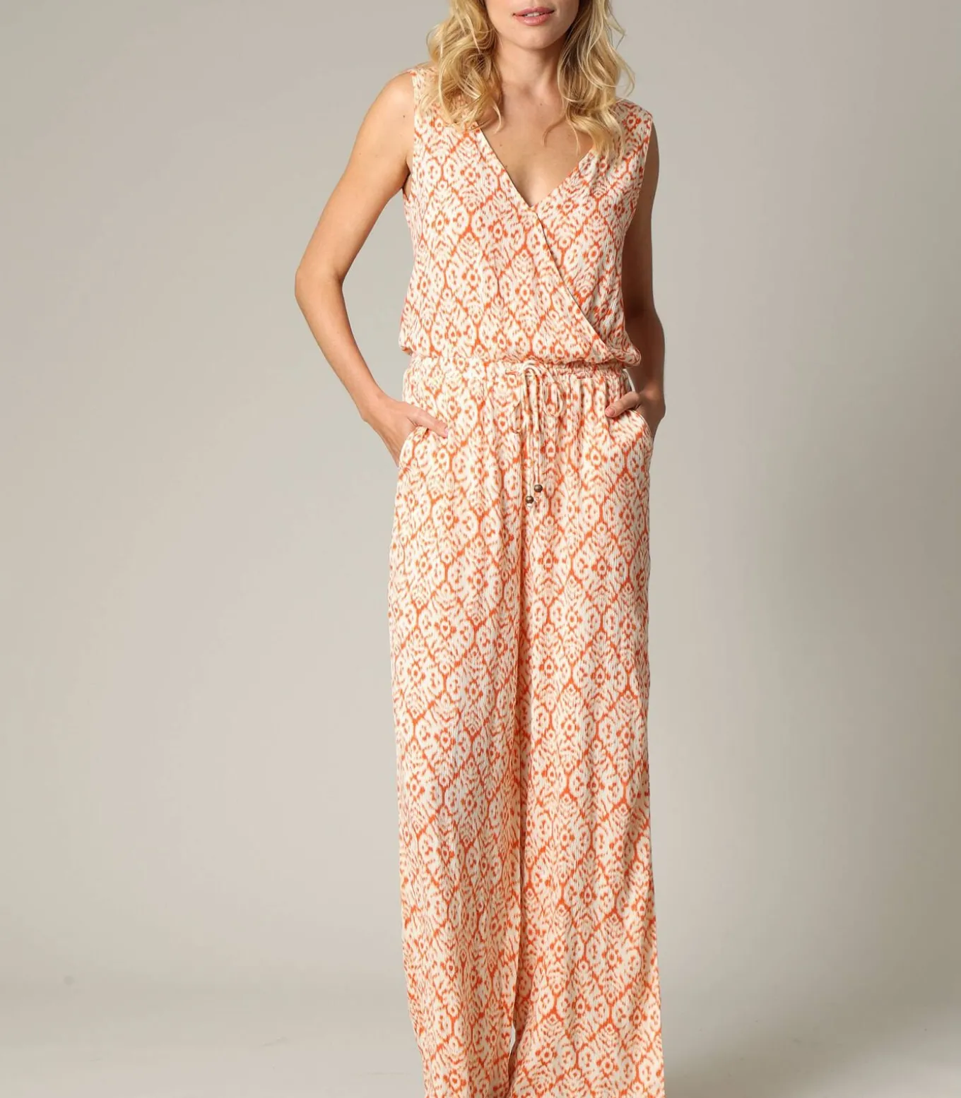Materiaal: 100% viscose crêpeBoheems patroon met oranje en witte etnische printMouwloze snitElegante wikkelhalslijnPraktische sluiting en soepele snit voor optimaal comfortHou je van bohemien en relaxte mode? Val voor de jumpsuit MIRZOU en breng een vleugje frisheid in je zomergarderobe. Dit mouwloze model van lichtgewicht viscose–crêpe is perfect voor warme zomerdagen en blijft toch chic en elegant.Het voordeel: de grafische print in oranje en witte tinten geeft het een unieke en verfijnde stijl. De wikkelhalslijn en het verstelbare trekkoord in de taille zorgen voor een vrouwelijke touch die je figuur accentueert.