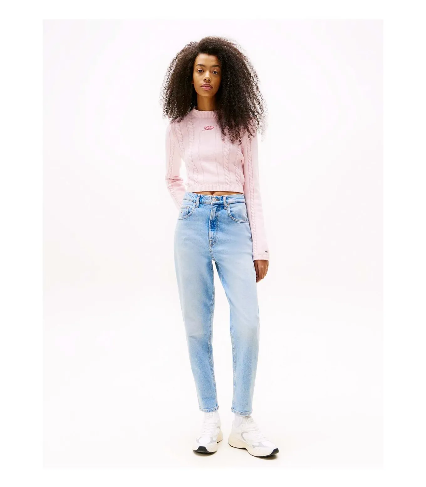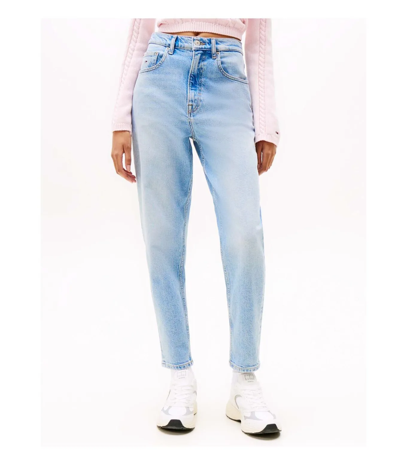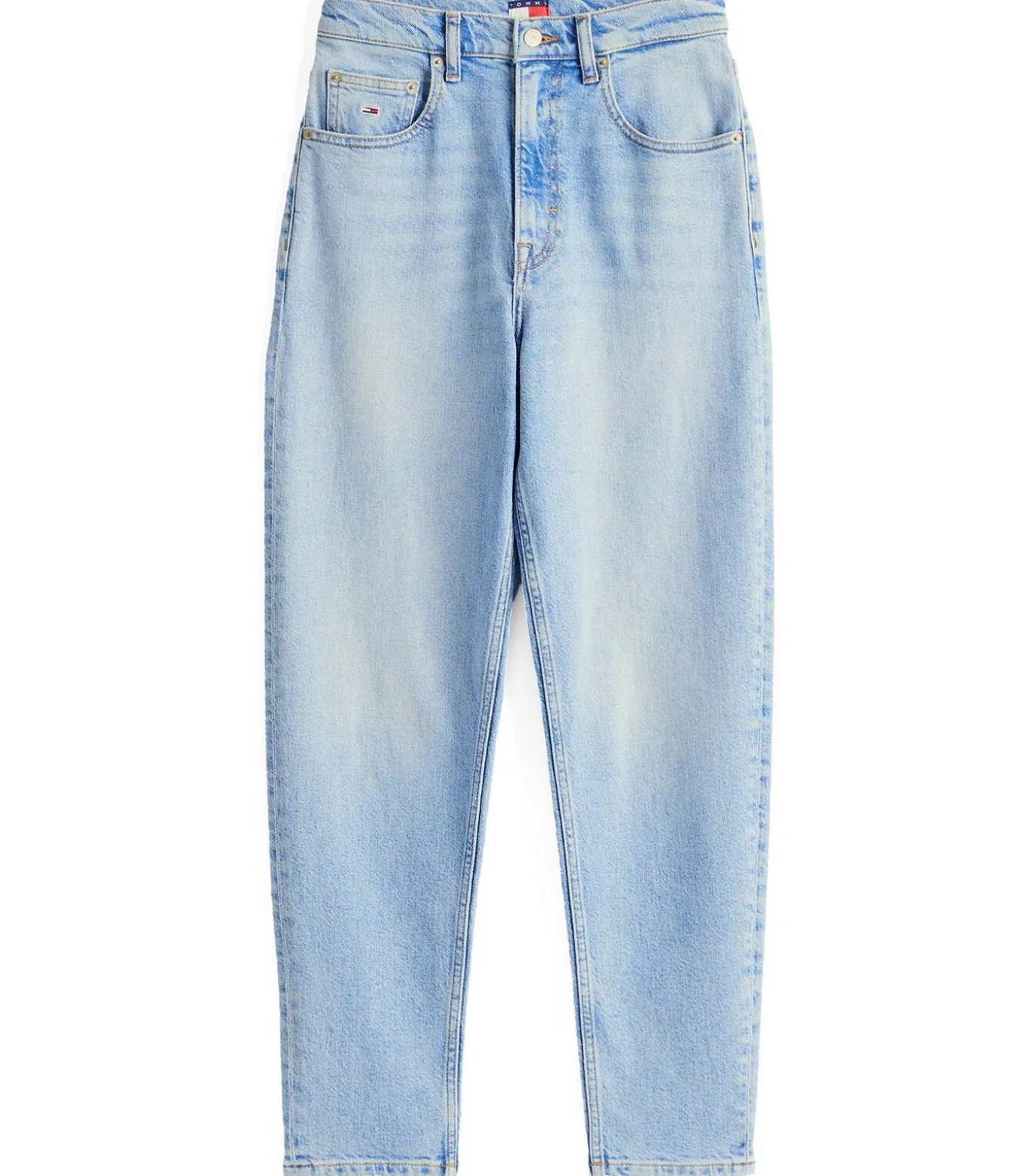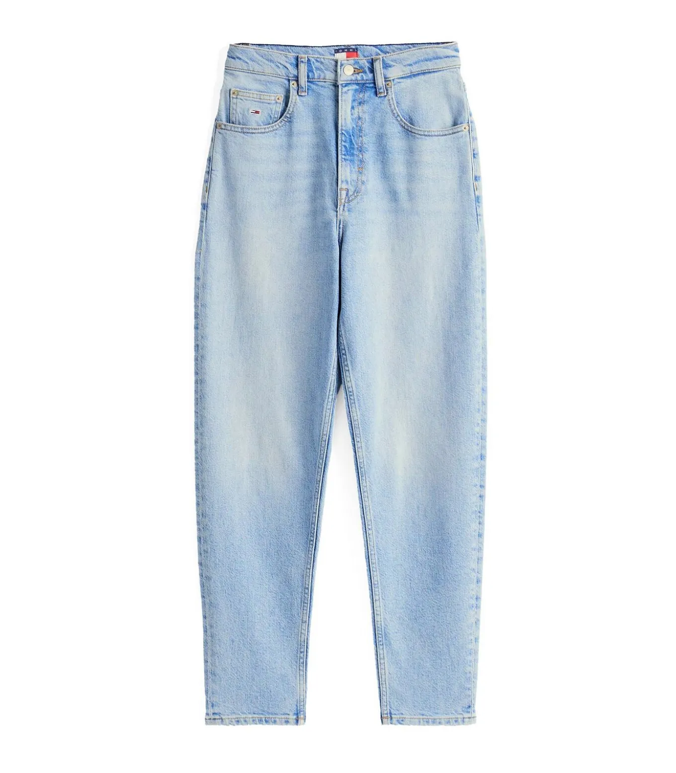 Kleur: Licht denim Samenstelling: 81% katoen, 18% lyocell, 1% elastaan Lengte: Lang Pasvorm: Normale pasvorm, Mom–pasvorm Details: Stretchdenim met all–over faded, five–pocket–model met Tommy Jeans–vlag op het muntzakje en de achterzak Gebruik: Ideaal voor vrouwelijke en casual looks met een retrogevoel, perfect met crop tops of strakke shirts