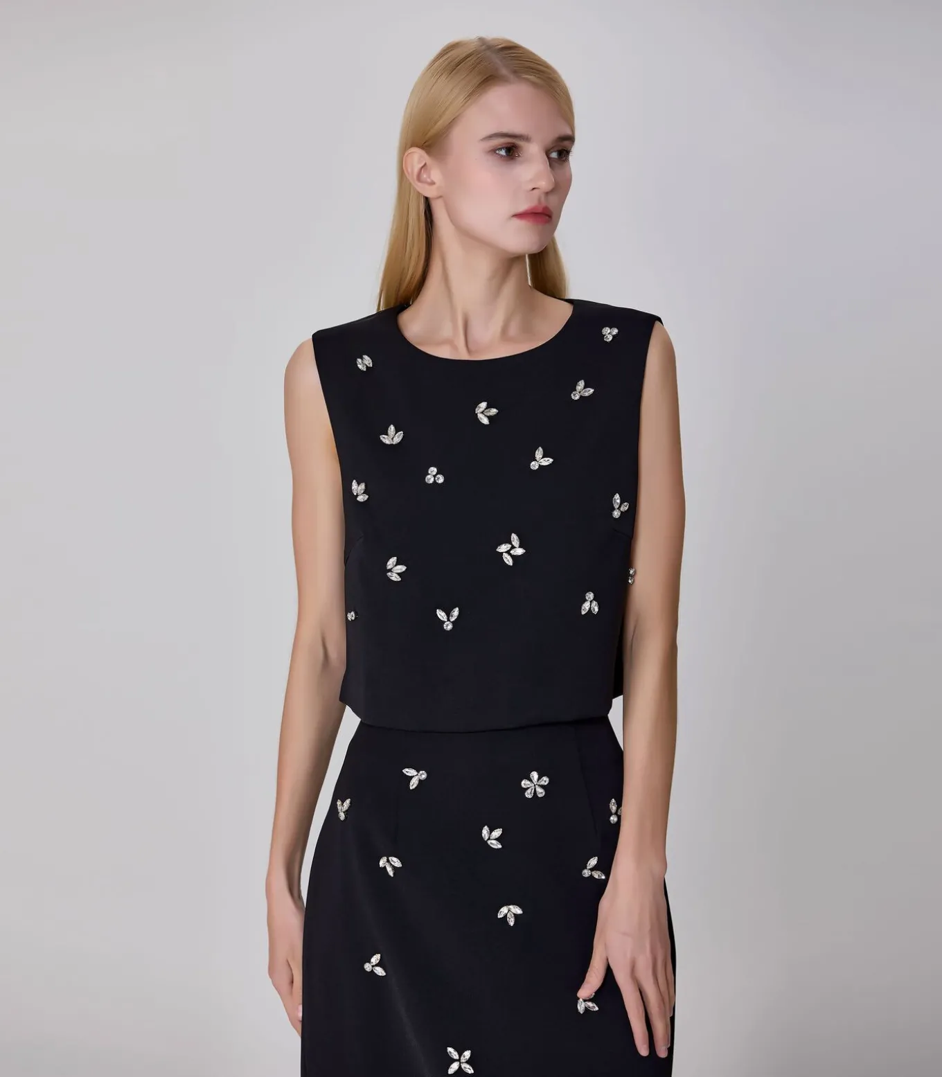 Deze mouwloze top heeft een korte, rechte en gestructureerde snit met een elegante boothals. Hij is gemaakt van een dikke, gladde stof die uitstekend valt. De voorkant is versierd met reliëfborduurwerk in de vorm van juwelen, wat het ontwerp extra glans en verfijning geeft. Deze versieringen zijn gelijkmatig verdeeld over de hele voorkant van de top, wat zorgt voor een vleugje ingetogen verfijning. De achterkant is gestroomlijnder en wordt gesloten met een doorlopende, ton–sur–ton rits. Deze top… De eigentijdse en elegante look kan worden gedragen met een rok met hoge taille of een pantalon voor een chique, elegante en moderne outfit.Productdetails:• Lengte: 41 cm• Pasvorm: Recht en kort• Halslijn: Boothals• Sluiting: Zichtbare rits op de rug• Details: Geborduurde juwelenversieringen op de voorkantSamenstelling en onderhoud:• Hoofdmateriaal: 100% polyester• Voering: 100% polyester• Machinewas op maximaal 30 °C met een fijnwasprogramma Strijken op lage temperatuur / Niet bleken• Niet in de droger