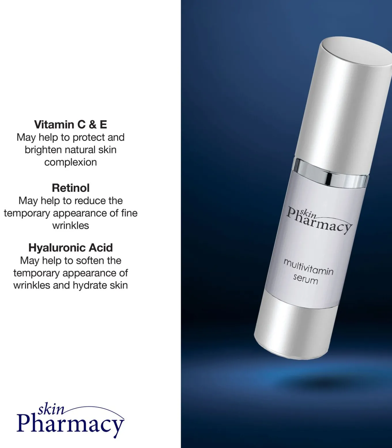 Ingrediënten:The skinPharmacy Multivitamin Serum contains high concentrations of vitamins to hydrate, brighten and plump the skin. This is a refined and rejuvenating serum that aims to brighten and stimulate the skin while protecting it against seasonal and environmental changes that can lead to visible signs of aging. The main active ingredients in the formulation are:1) Vitamin A and B5 aim to protect the skin from environment stresses2) Vitamin E aims to protect the skin from UV damage and works as an anti-Inflammatory3) Vitamin C works to firm and boost the skinWho should use Multivitamin Serum?Use this product if you have dry skinUse this product if you have sensitive skinUse this product if you are concerned about skin damageUse this product for firmer skinUse this product for increased radiance