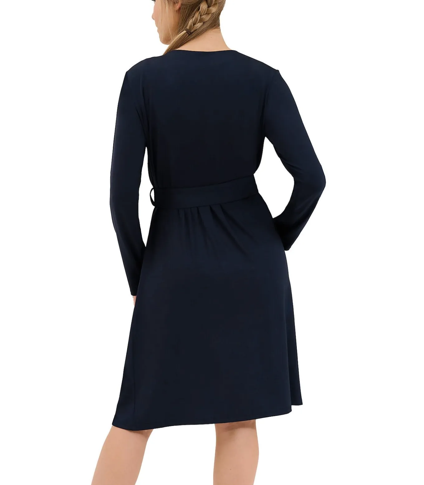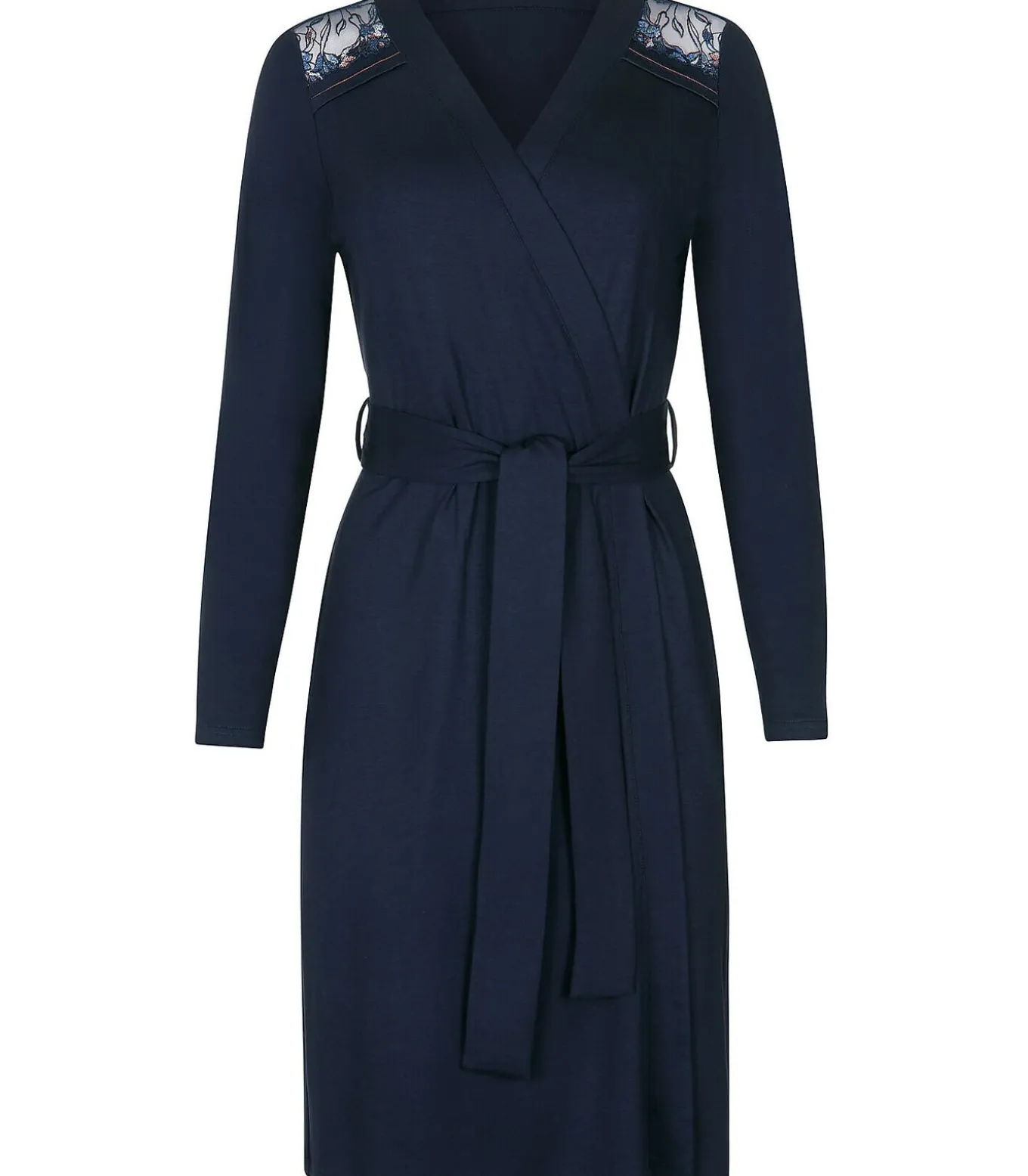 Comfortabel, elegant ontwerp in een zacht, comfortabel breisel. Luxueus borduursel en plooien aan de voorkant. Bies en ceintuursluiting aan de voorkant. Lengte ca. 100 cm.