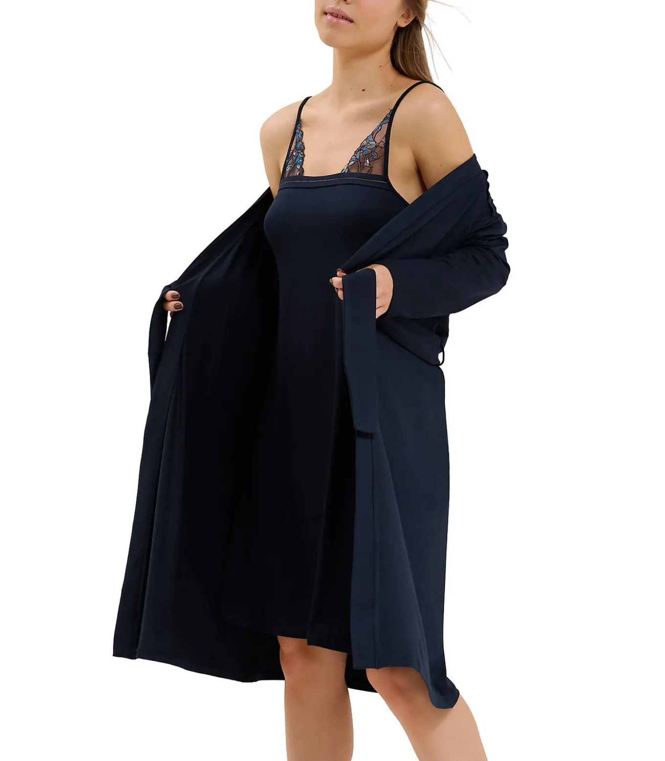 Damespyjama van comfortabel Vortex viscosebreisel met geborduurde inzetstukken. De stof voelt verfijnd aan en valt mooi; het zachte, comfortabele viscosebreisel voelt aan als een tweede huid. Modern en elegant, vrouwelijk en verleidelijk, maar toch verfijnd, praktisch en comfortabel. Het bloemenborduursel is licht en luchtig en accentueert de decoratieve plooi met kleurrijke stiksels. Verkrijgbaar in twee kleuren: de zachte kleur van een kus in bloei en de kleur van een blauwe schemering.[Jurk wordt apart verkocht. Nachtpon, schoenen en andere accessoires die het model op de foto’s draagt, zijn niet inbegrepen].