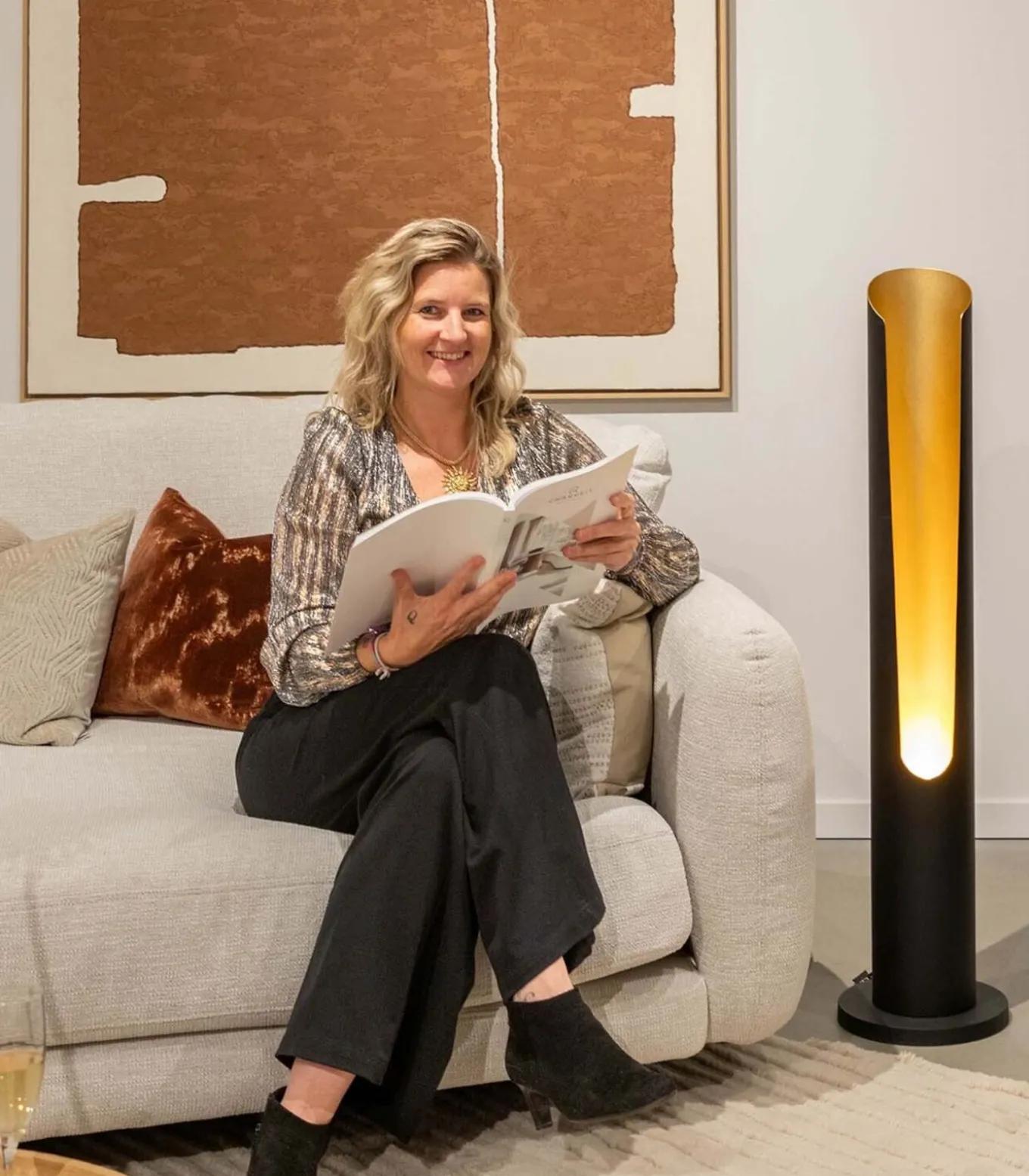 De Vloerlamp Nori is dé trendsetter van het moment! Met een zwarte gepoederlakte metalen buis en een gouden binnenkant creëert deze lamp een luxe uitstraling. Het warme licht zorgt voor een gezellige sfeer in elke ruimte. Met een hoogte van 110 cm en een diameter van 25 cm is Nori perfect voor naast de bank of in een hoek van de kamer. Een echte must–have voor je interieur! Zoekwoorden : staande lamp, vloerlamp, linnen, metaal, wit, zwart, modern, landelijk