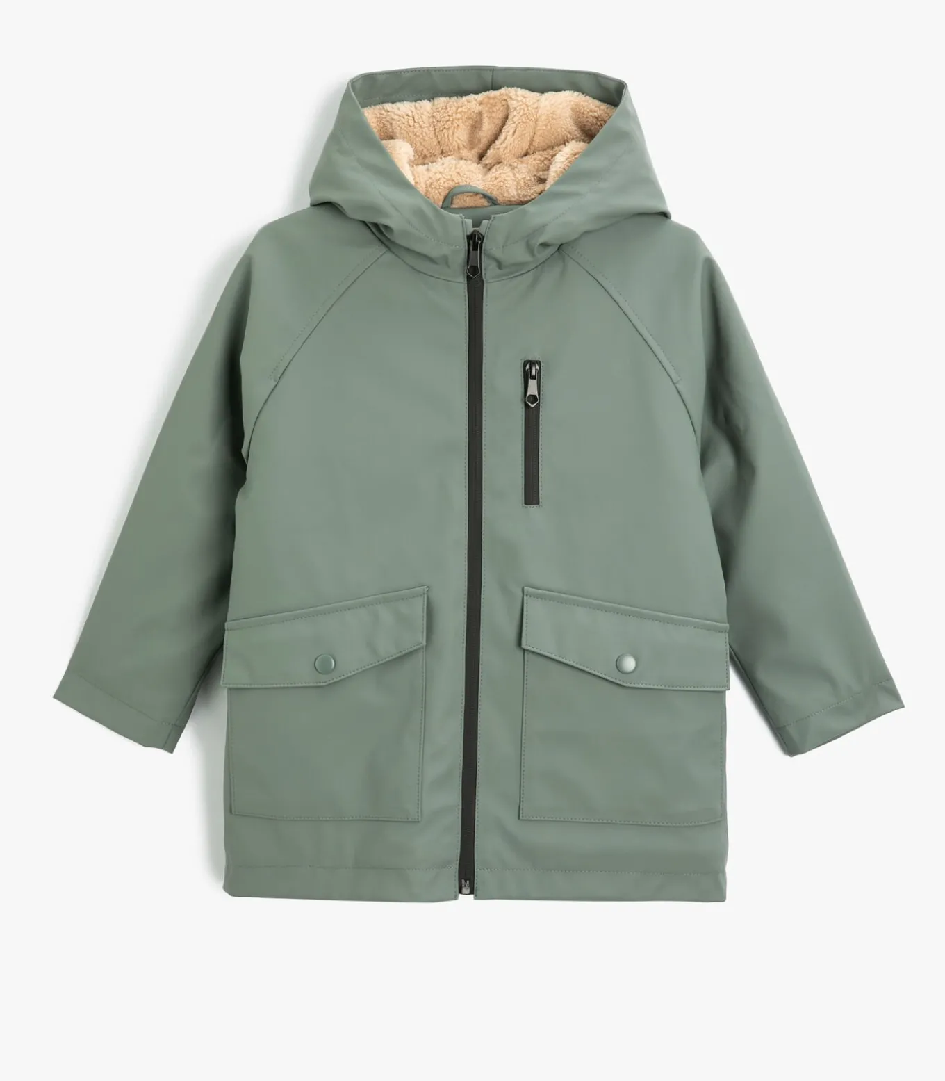 Gerecycled polyester Rits gedetailleerd Normaal Dubbele zak met klep Heup lengte Raglan mouw Lange mouw Sherpa gevoerde capuchon Trenchcoat