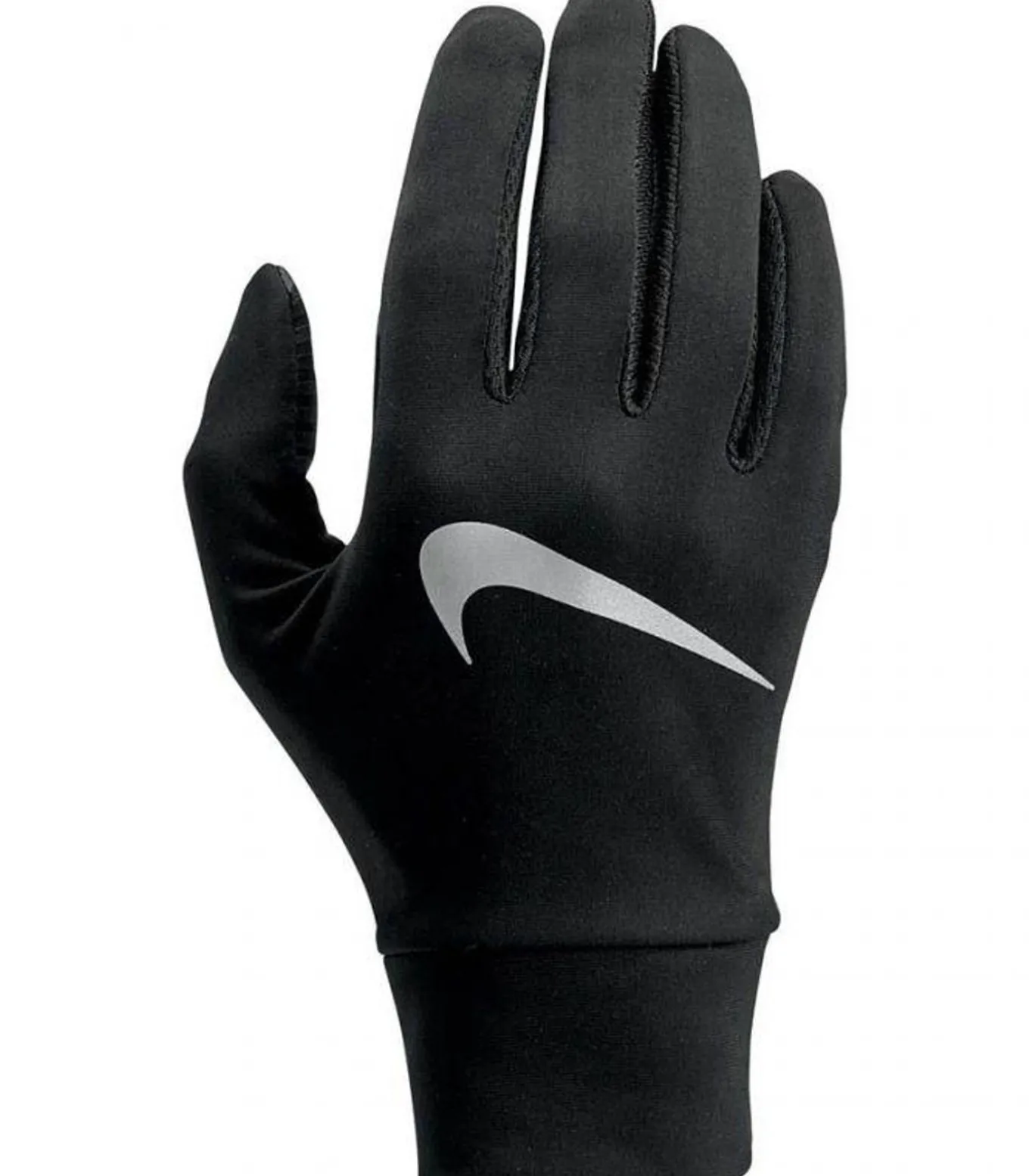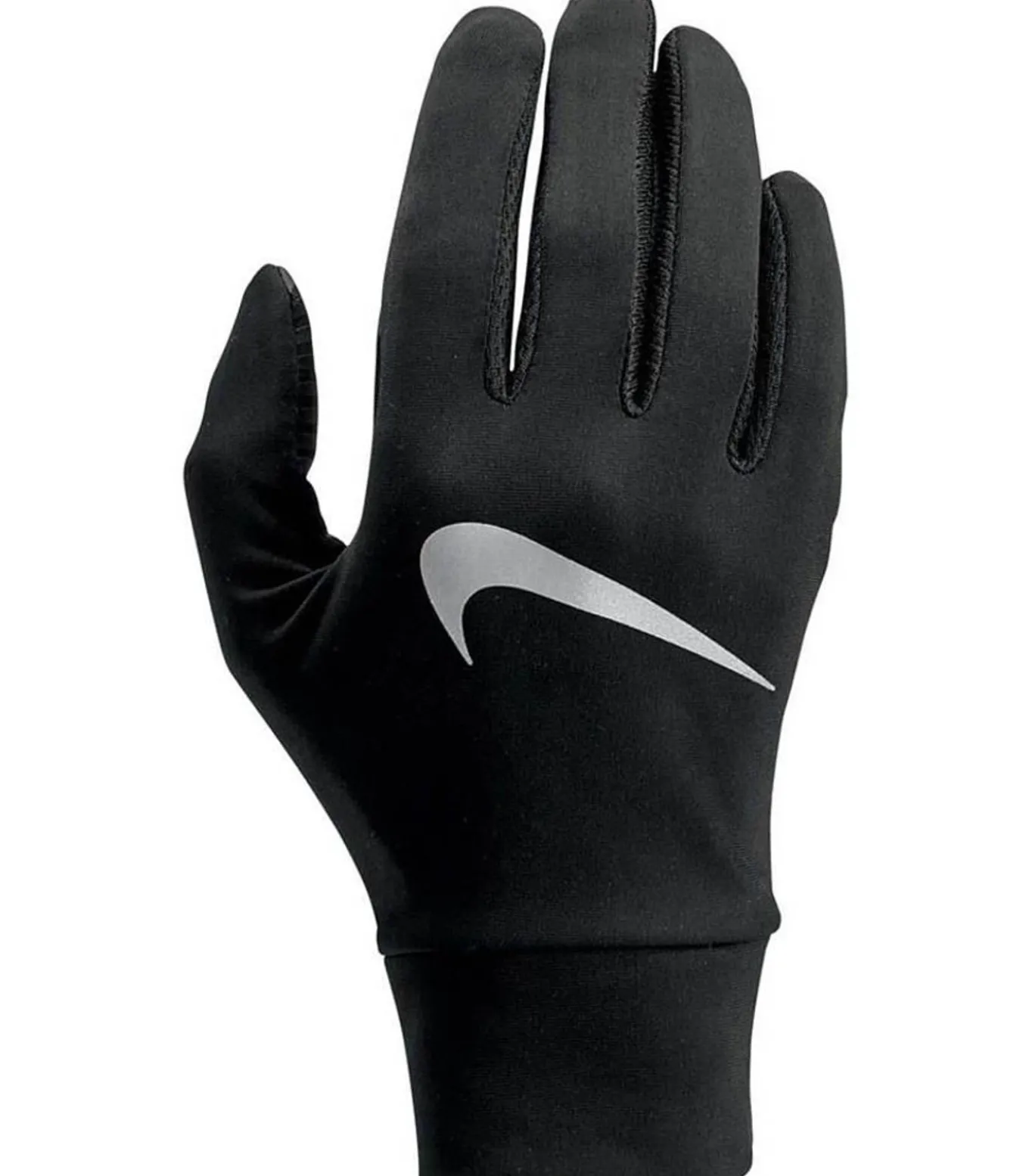 Nike–merk handschoenen, artikelnummer NRGM1082 in zwart. Deze handdoekjes zijn gemaakt van 85% polyester en 15% elastane. De stof is technisch, uitgerust met de Dri–FIT–technologie voor lichtgewicht, waterafstotend en snel droogend. De manchetten zijn elastiek. Het ontwerp is glad, reflecterend en verzierd met een Swoosh–logo.