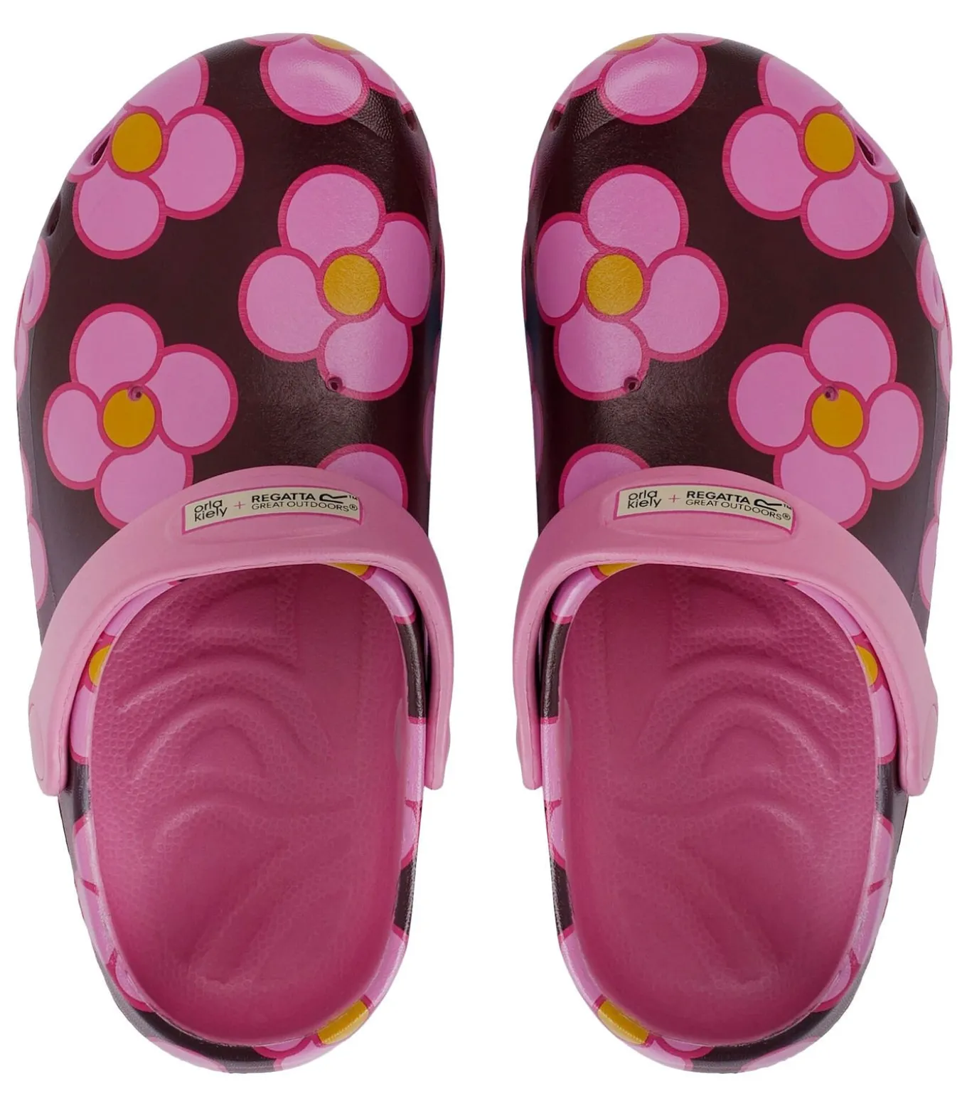 Regatta ORLA KIELY roze schoenen met een EVA schuim bovenstuk en een versterkt binnenzool. De buitenzool bestaat uit voorgevormd EVA schuim met rubber. Deze schoenen hebben een duurzame, flexibele en lichtgewicht soffietechnologie. Ze beschikken over schuine nokken en een draaibare hielriem. Het ontwerp is uitgerust met het logo en een draaiende bloem. Deze schoenen hebben een ronde teenstijl en zijn geschikt voor aanslijting.