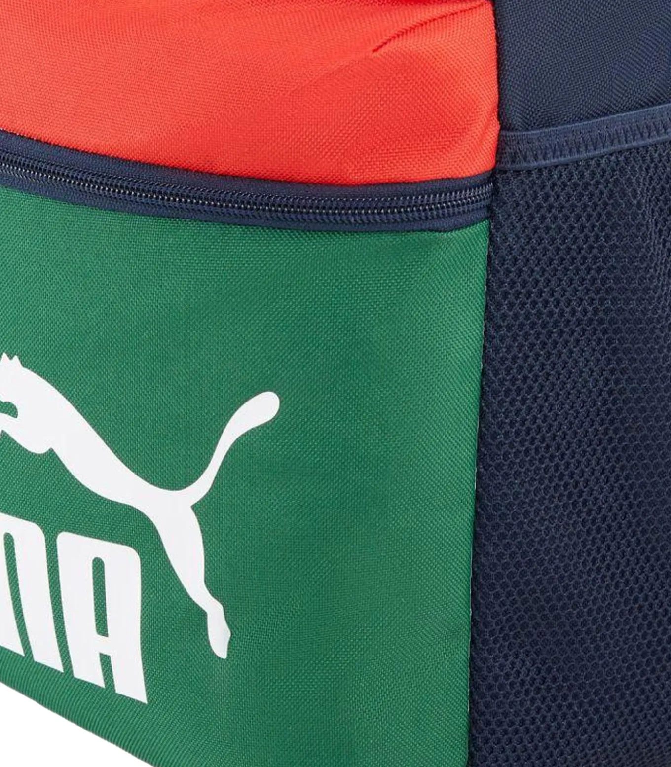 Puma PHASE–ruzak Marineblauw is een 100% polyester rugzak met een hoogte van 44 cm, breedte van 30 cm en een capaciteit van 22 L. De diepte bedraagt 14 cm en de zak heeft een voorzak, rits, één zijzak en een gaaszak. Het handvat is gewatteerd, de schouderriemen zijn verstelbaar en de rugpaneel is eveneens gewatteerd. Dit ontwerp toont een kleurenblok met het logo van Puma. Deze zak is gemaakt van hergebruikte materialen en wordt vastgehouden met een tweewegrits.