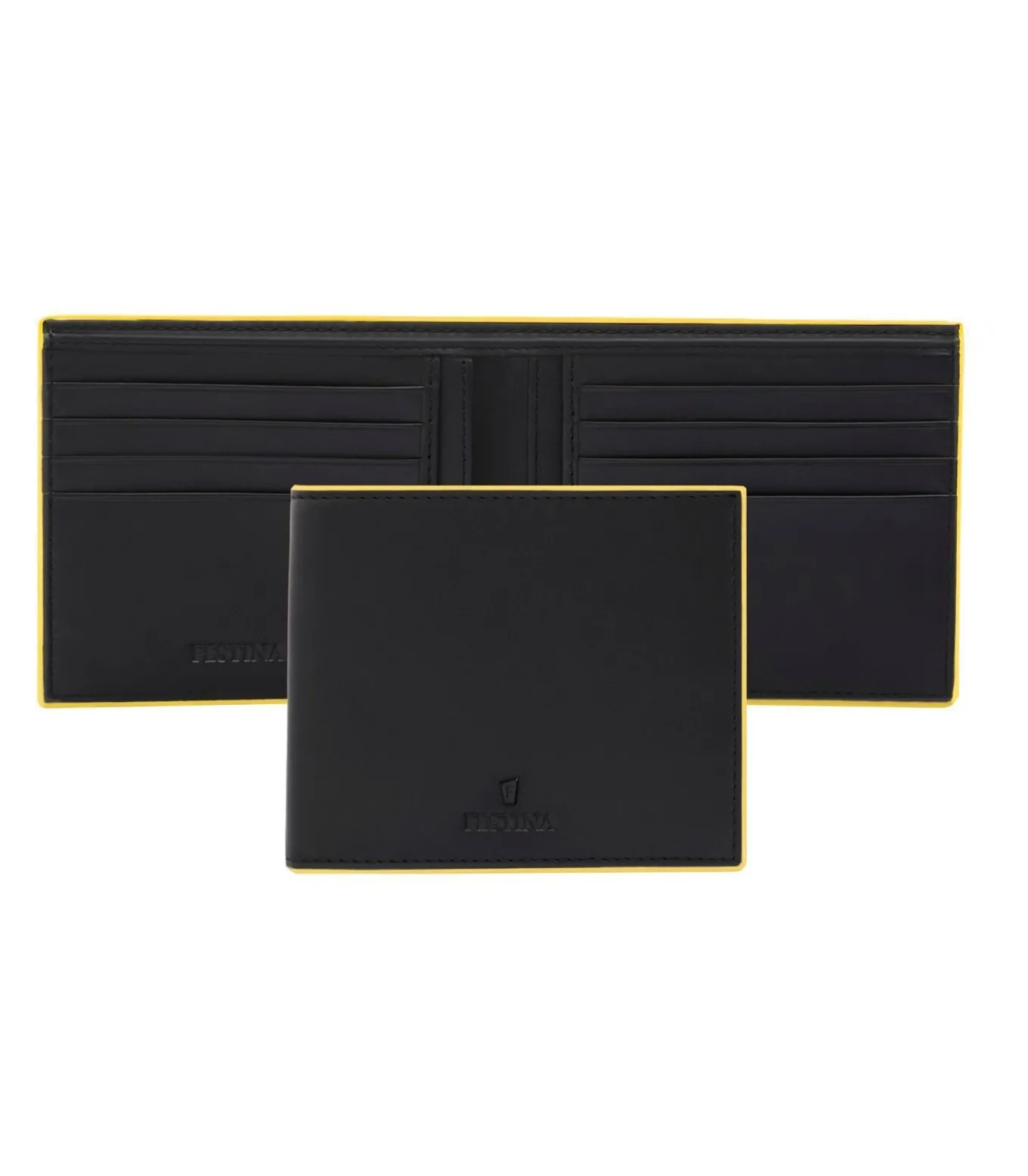 De Black Edition portemonnee van Festina getuigt van tijdloze elegantie met een gedurfde twist. De portemonnee is gemaakt van zorgvuldig geselecteerd matzwart leer en is gesigneerd met het iconische F–plaatje in een ton–sur–ton matzwarte afwerking. Het ontwerp is opgewaardeerd met levendige gele randdetails, die een dynamisch contrast toevoegen aan de strakke esthetiek. Deze klassieke portemonnee heeft acht kaartsleuven, vier zijvakken en een groot compartiment voor biljetten, verdeeld in twee vakken, en biedt uitzonderlijke functionaliteit met een verfijnde stijl. Een echte klassieker in een nieuw jasje voor het moderne tijdperk. Dimensions: 115 x 20 x 95 mm, Material: Cowhide leather