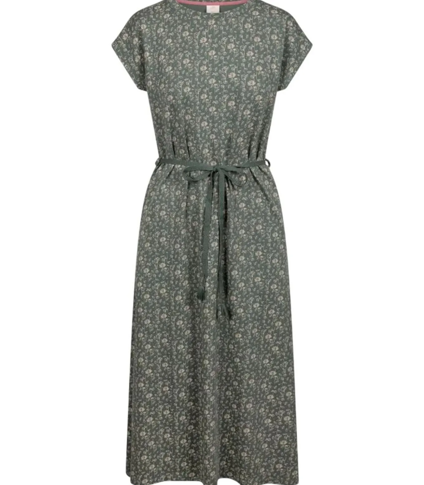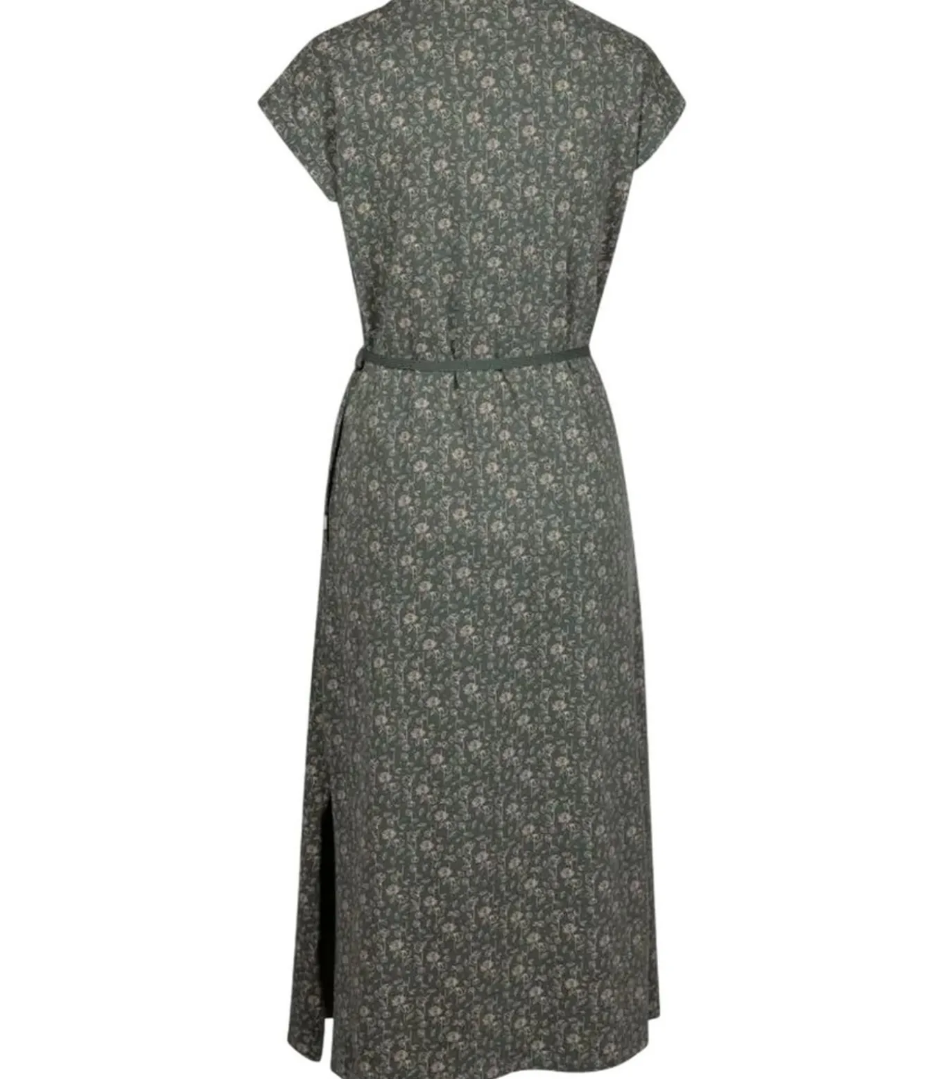 Trespass–merkproduct PORTIA met groene kleur, gemaakt van 95% polyester en 5% elastane. Het ontwerp bevat bloemenmotieven verspreid over de hele jurk. De jurk heeft zijlijsten en een tailleband. De hals is rond en de mouw is bedekt. Het heeft twee zijzakken. Maat XS is 32 inch, M is 34 inch, L is 40 inch en XXL is 42 inch.
