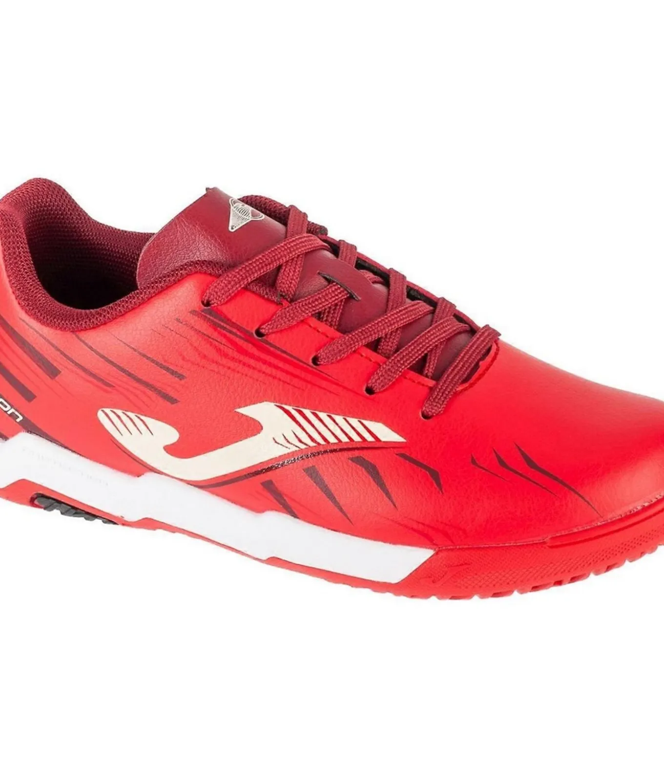 Joma–voorstelling Propulsion – Rode bal: Een synthetisch leder bovenstuk met een synthetisch binnenzool en buitenzool van gegrepen rubber, met vijf vlakke, laag gesneden ogen. Het ontwerp kenmerkt zich door contrastende details en het logo, met een rond toetslus–ontwerp.