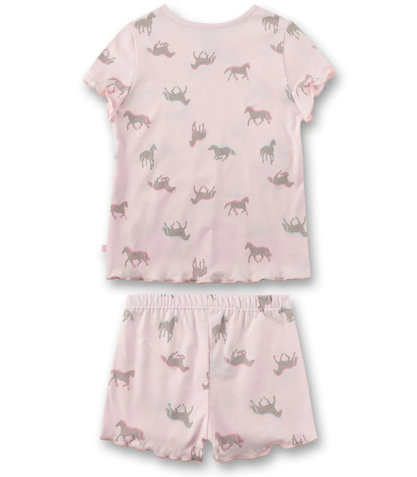 Korte pyjamaset voor meisjes van het merk Sanetta. Top en shorts met korte mouwen, all–over print, single jersey van aangenaam zacht biologisch katoen.