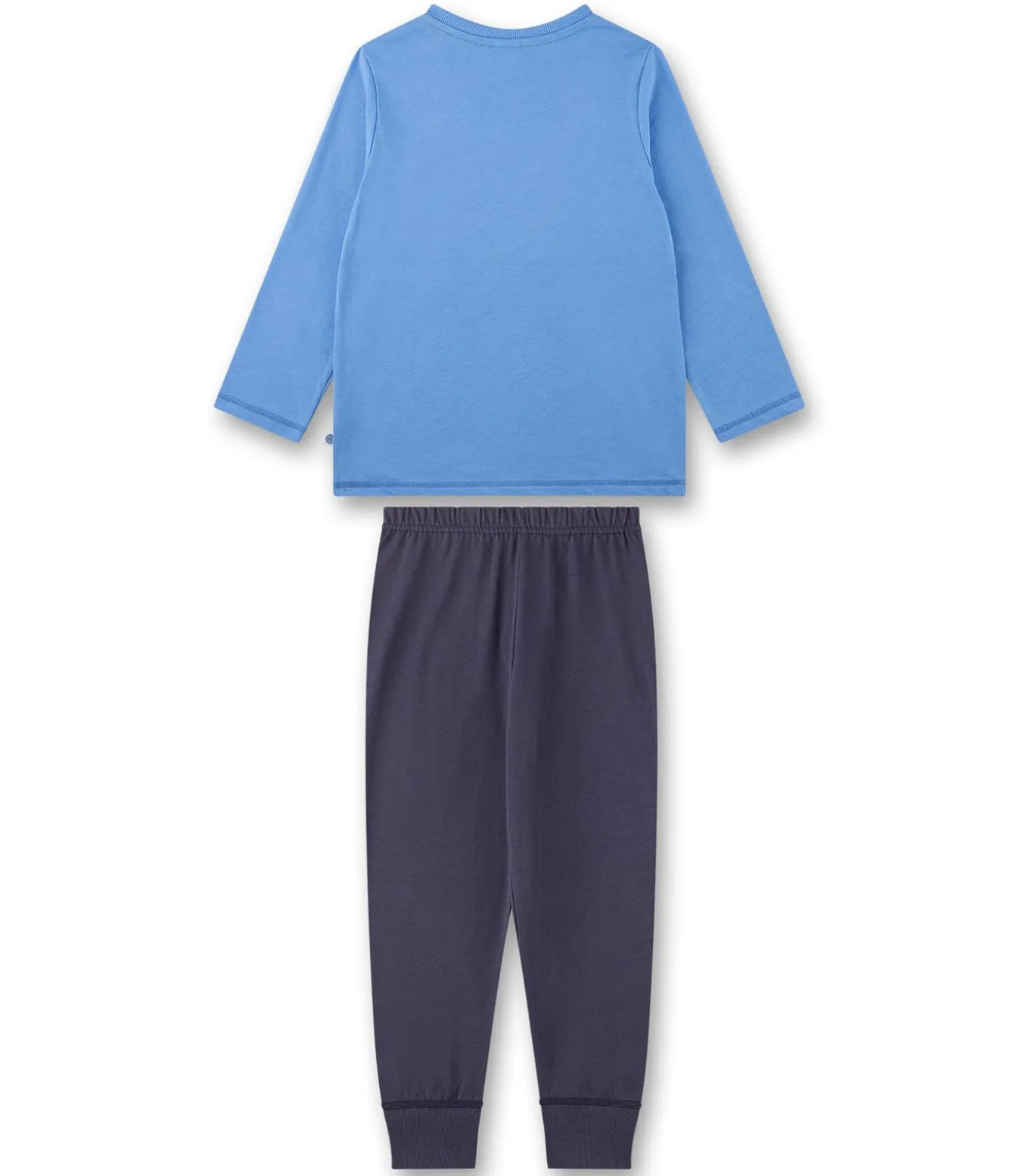 Lange pyjama voor jongens van het merk Sanetta. T–shirt met motief en ronde hals. Effen lange pyjamabroek met elastiek in de taille.