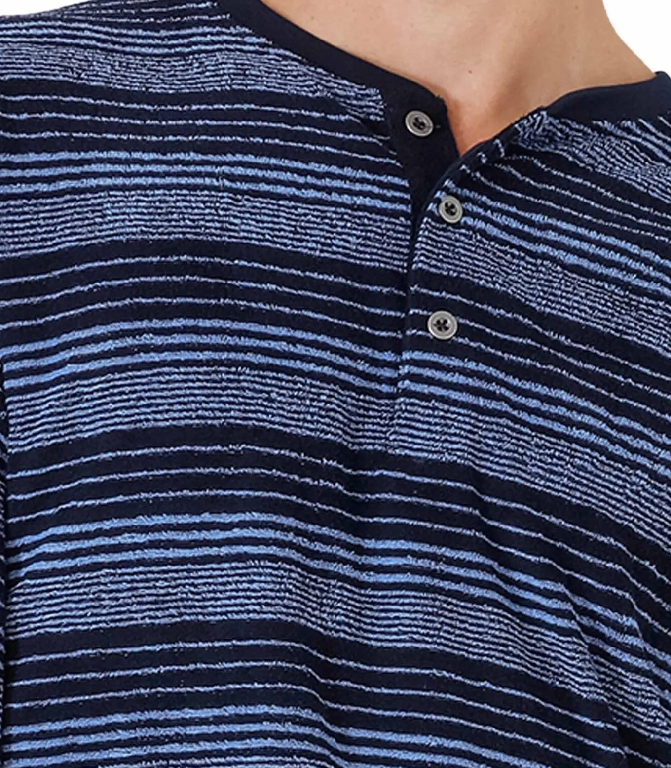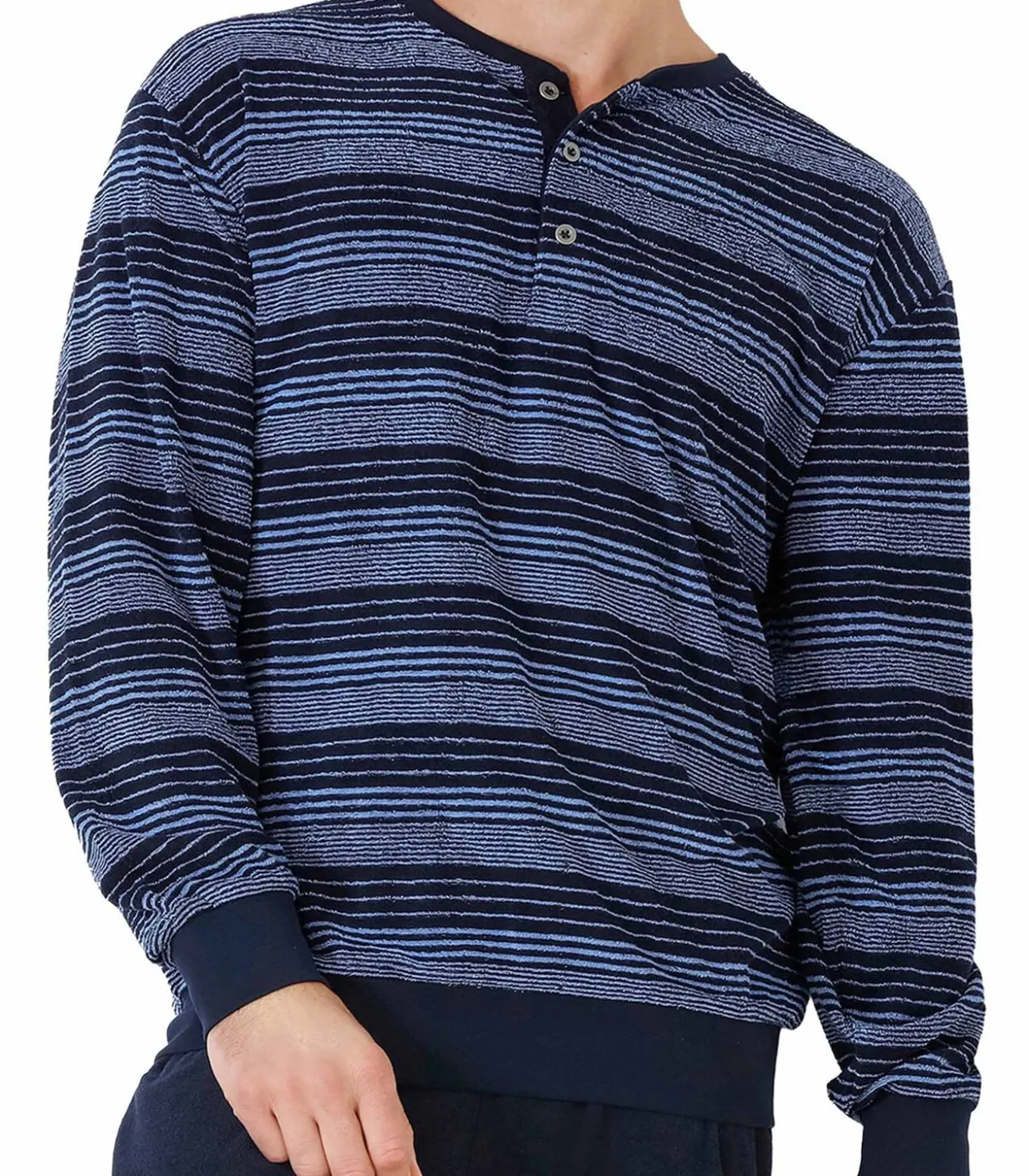 hajo Pyjama voor heren. Shirt met lange mouwen, ronde hals en boorden. Lange, effen broek. Pyjama van warm badstof.