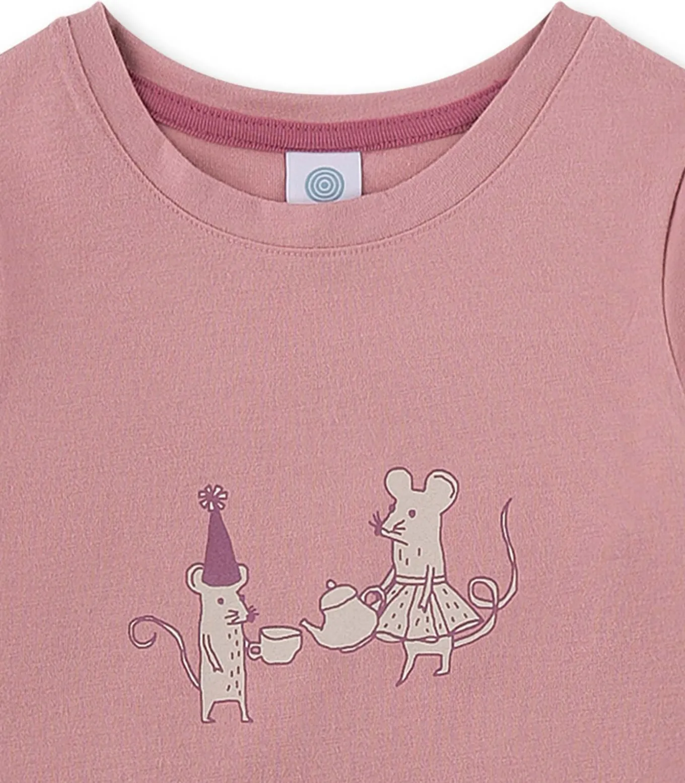 Sanetta pyjama voor meisjes. Lange pyjama van velours. Shirt met lange mouwen, ronde hals en motief. Comfortabele, effen slaapbroek.