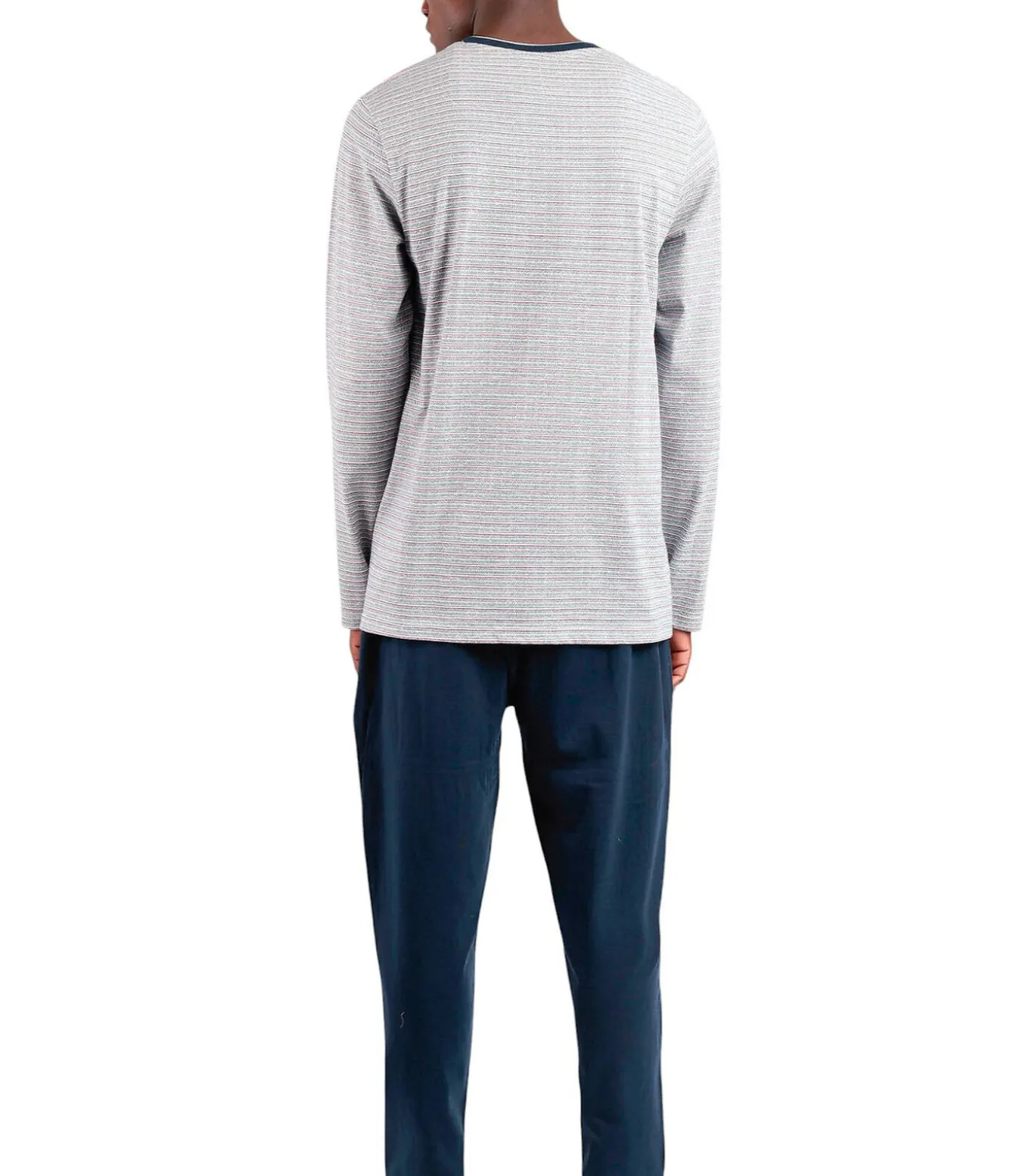 Pyjamaset die je gemakkelijk in huis kunt dragen op ontspannen dagen. Hij is gemaakt van lichtgewicht, ademend katoen en bestaat uit een lange broek en een top met lange mouwen. De effen broek heeft praktische steekzakken. De comfortabele top met lange mouwen heeft een ronde kraag met een knoopsluiting en een klein borstzakje met een geborduurd Admas–detail. Het is bedrukt met fijne strepen die bestaan uit kleine korenaren op een rij. De ronde kraag is geaccentueerd met een bies in dezelfde kleur als de shorts. Admas Classic collectie box set.