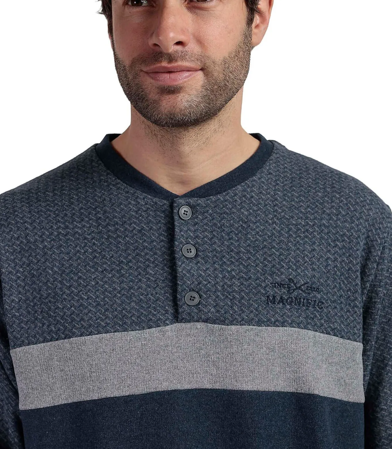 Een comfortabel, modern tweedelig stuk ontworpen om warmte en stijl in huis te brengen. De katoenmix is warm en zacht, maar toch ademend. De top heeft een klassieke snit met lange mouwen en een ronde hals met een praktische, elegante knoopsluiting met drie knopen. De top heeft een klein, discreet geometrisch patroon over de hele stof en een klein, discreet geborduurd logo op de buste. Een horizontale grijze streep contrasteert op de borst, terwijl het effen onderste gedeelte een sobere, chique touch toevoegt. De recht gesneden broek is nauwsluitend bij de enkels met ribboorden voor een goede pasvorm. Hetzelfde discrete patroon als op de top zorgt voor een mooie visuele harmonie. Met zijn gestructureerde, moderne ontwerp biedt deze pyjama optimaal comfort voor ’s nachts of wanneer je je thuis ontspant. Chic, praktisch en knus, ideaal voor mannen die er op hun best uit willen zien, zelfs wanneer ze zich ontspannen. Geleverd in een Admas geschenkverpakking.