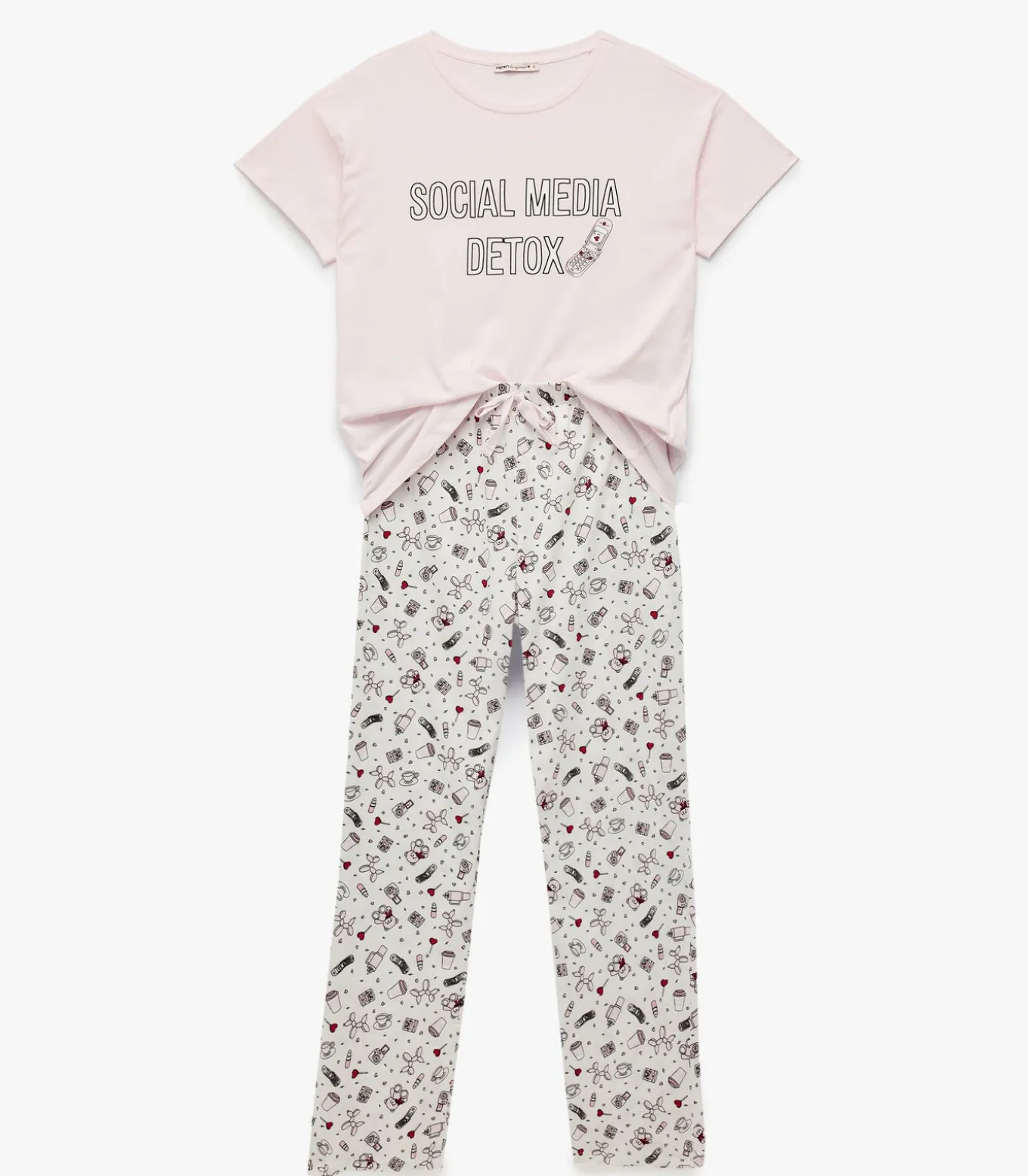 Deze moderne pyjama set biedt zowel comfort als stijl voor je huiselijke momenten. Het t–shirt met korte mouwen en ronde hals zorgt voor een comfortabele pasvorm, terwijl de lange broek met elastische taille en speelse print je look compleet maakt. Geniet van het zachte, ademende katoen dat de hele dag luchtig aanvoelt. Ideaal voor ontspannen dagen thuis of gezellige filmavonden.