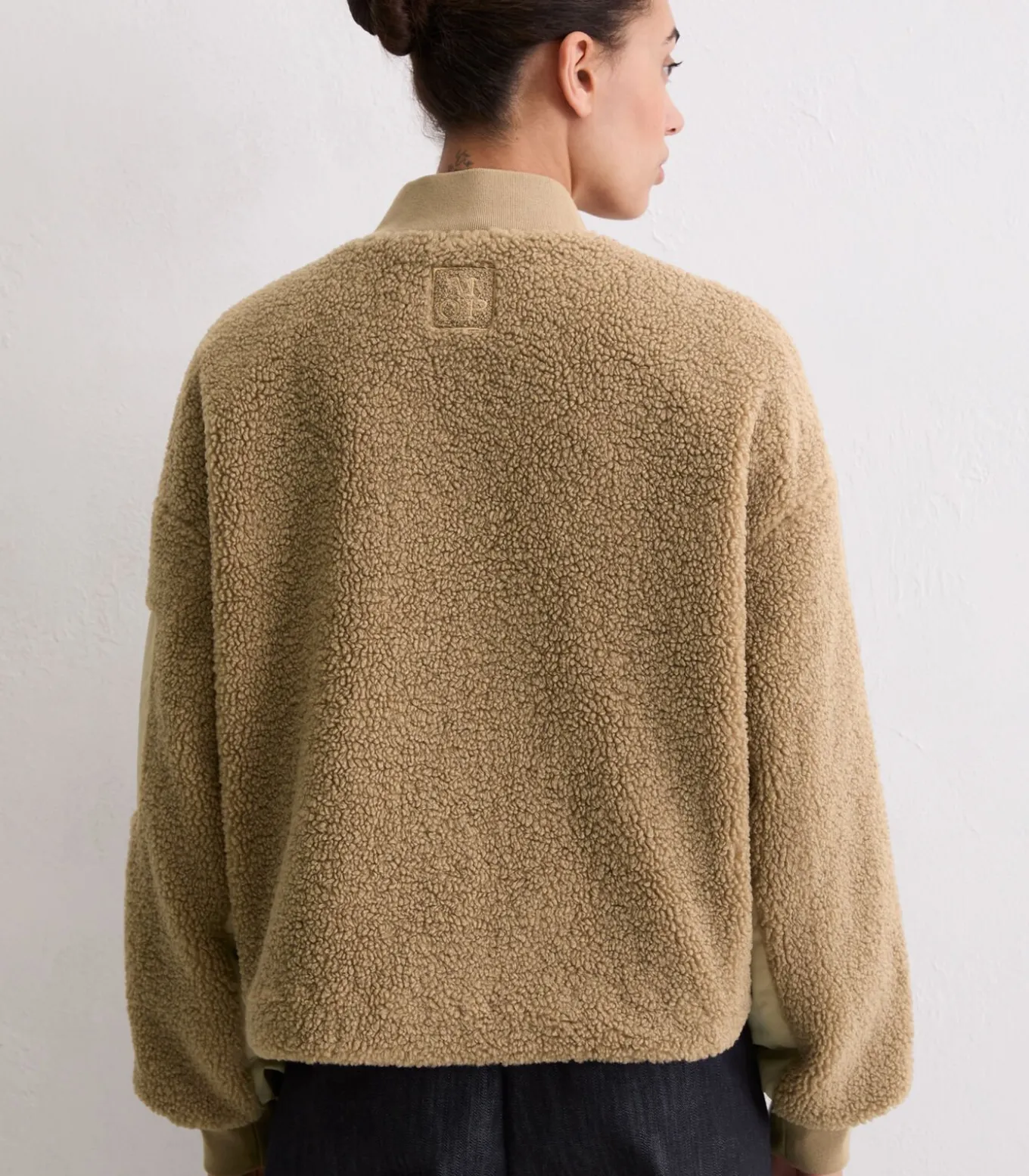 De lichtere en kortere versie van de populaire teddyjas en onbetwiste fashionfavoriet: de korte teddyjas in blousonstijl van zacht krullend pluche. De jas heeft een casual snit, een geribde kraag, afhangende schouders, een robuuste ritssluiting aan de voorkant met paspels en een ingelegde stormsluiting, praktische, eenvoudige paspelzakken en een opgestikte zak met ritssluiting op de mouw. De lange mouwen zijn afgewerkt met klassieke geribde boorden. Combineer met een smalle broek en hoge laarzen voor een casual silhouet. De jas is volledig gevoerd, licht gewatteerd en kan worden aangepast van een rechte vorm naar een coole O–vorm met behulp van een trekkoord aan de zoom. De kleurgecoördineerde geweven details zijn bijzonder opvallend.
