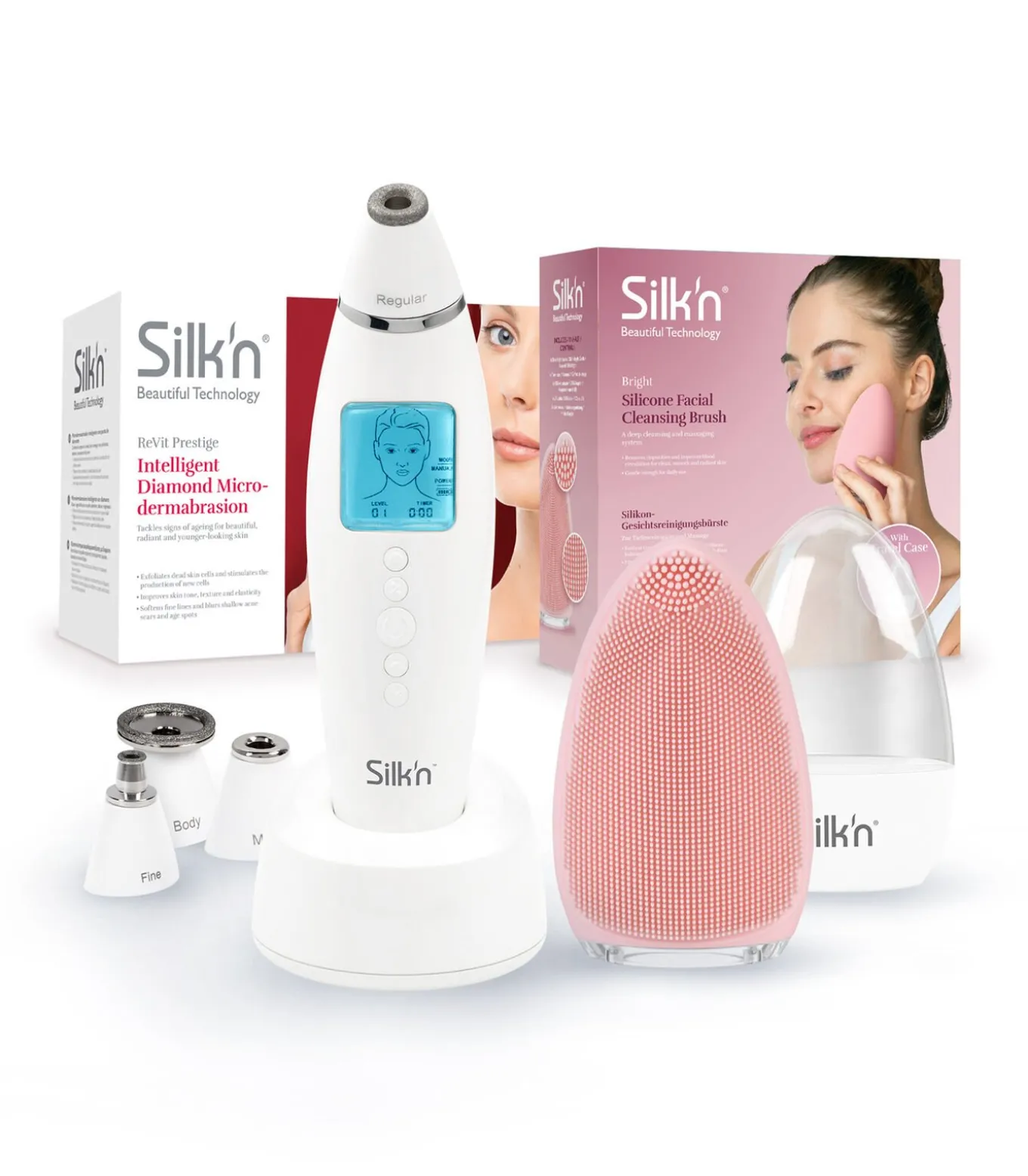 Silk’n ReVit Prestige is de ultieme oplossing voor iedereen die een stevige, stralende en jonger uitziende huid wil op het gezicht en lichaam. Dankzij het LCD–display kun je zeker zijn van een gestructureerde huidbehandeling. Ontdek wat een peeling met dit krachtige microdermabrasie–apparaat voor jou kan doen!Behoud de prachtige effecten van de ReVit Prestige met de Silk’n Bright ultra–hygiënische siliconen gezichtsborstel. Bright verwijdert vuil en make–upresten in seconden, ontstopte poriën en exfolieert zachtjes. De diamanten behandelingstips van de ReVit Prestige zijn bedoeld om tot twee keer per week te worden gebruikt; de Bright is geschikt voor dagelijks gebruik om je gezonde, perzikachtige gloed te behouden.