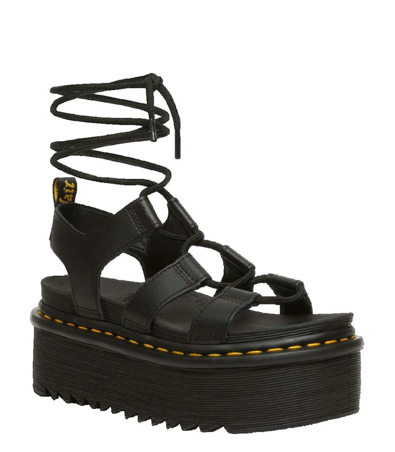De Nartilla sandalen van Dr. Martens zijn een iconische klassieker, herkenbaar aan hun extra lange veters. Deze versie heeft een dikke Quad Zebrilus zool voor een unieke uitstraling, met touwveters, kenmerkende gele stiksels en een hieltab.