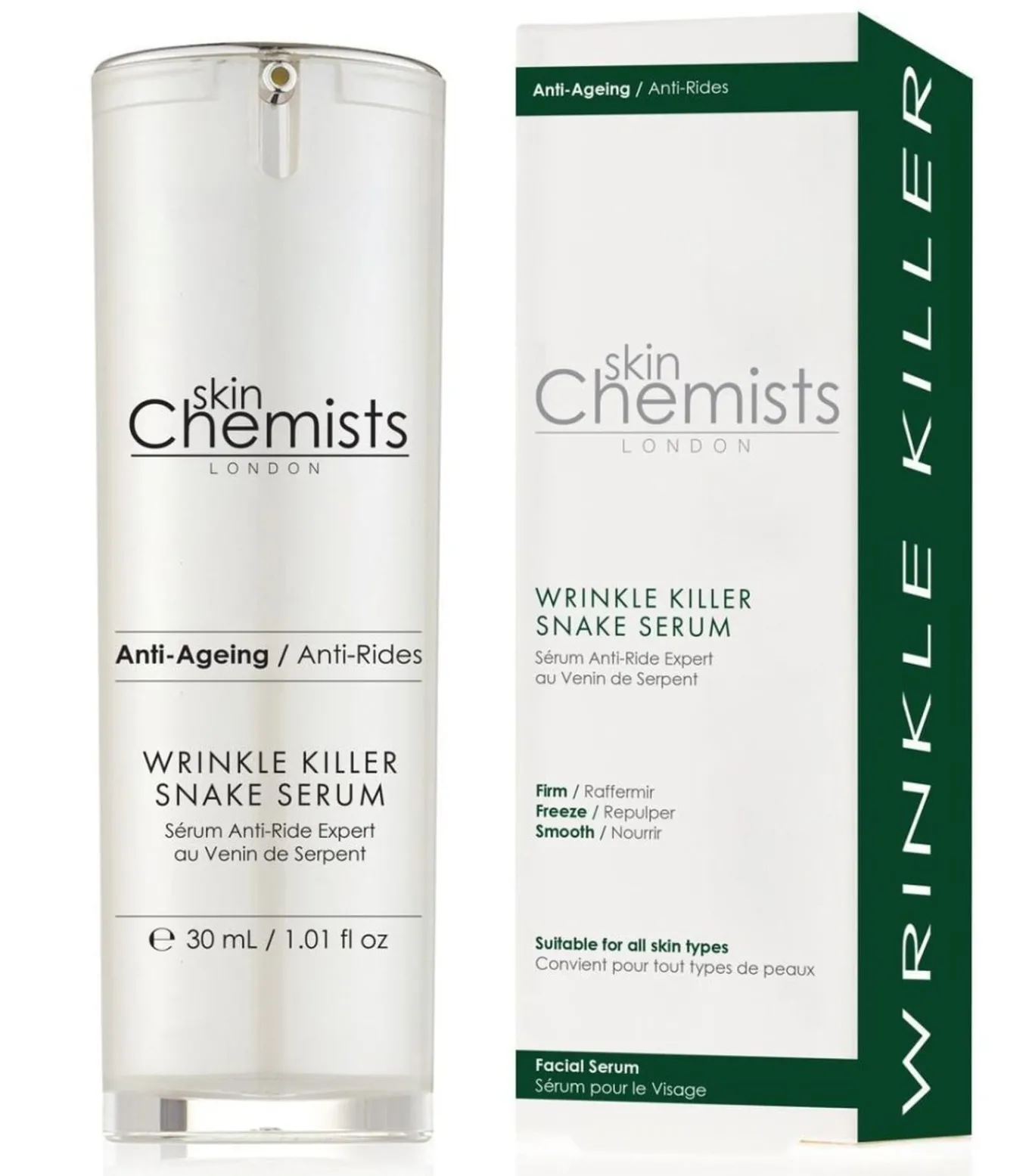 Voor welk huidtype is dit product geschikt?✔ De beste resultaten zijn zichtbaar bij rijpere huid.Wat het is:✔ Anti–aging gezichtsserum✔ Richt zich op het zichtbaar gladder maken van fijne lijntjes en rimpels✔ Gehydrateerd, jeugdig ogend teintBeschrijving:Ons Wrinkle Killer Snake Serum is ontworpen om de huid te gladstrijken, te verstevigen en te hydrateren. Het bevat het bekroonde ingrediënt ‘Syn–Ake’, dat helpt de zichtbaarheid van fijne expressielijntjes en diepere rimpels te verminderen.Wetenschap:✔ Synthetic Syn–Ake tripeptide imiteert de werking van een peptide die voorkomt in het gif van de tempelviper en helpt de zichtbaarheid van rimpels en lachrimpels te verminderen✔ Antioxidantwerking beschermt tegen schade door vrije radicalen✔ Vochtvasthoudende eigenschappen verzachten en hydrateren de huidBelangrijkste Ingrediënten:• Syn–Ake: Helpt de zichtbaarheid van fijne lijntjes en rimpels te verminderen voor een jeugdigere teint.• Hyaluronzuur: Helpt de huid te hydrateren, waardoor de huid zachter, gladder en stralend gehydrateerd aanvoelt.• Allantoïne: Helpt de huid te voeden en te hydrateren voor een jeugdigere teint.