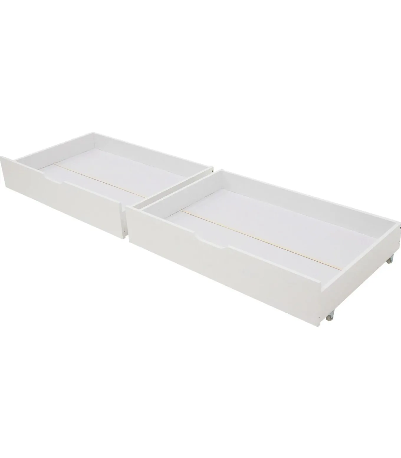 Om in de slaapkamer van onze jonge kinderen meer opbergruimte te hebben en toch ruimte om te spelen, zijn deze twee lades de ideale oplossing. Deze opberglades zijn geschikt voor een standaardbed van 190×90 cm en glijden met hun wieltjes netjes onder het bed. U kunt ze gebruiken om lakens, hoezen, sierkussens, de kleren van uw kind, speelgoed en nog veel meer in op te bergen. Op die manier hebt u een opgeruimde kamer en hoeft u geen extra opbergmeubel aan de kamer toe te voegen om ruimte te besparen. Deze twee laden zijn gemaakt van wit grenenhout, zijn stevig en passen bij het ledikant.