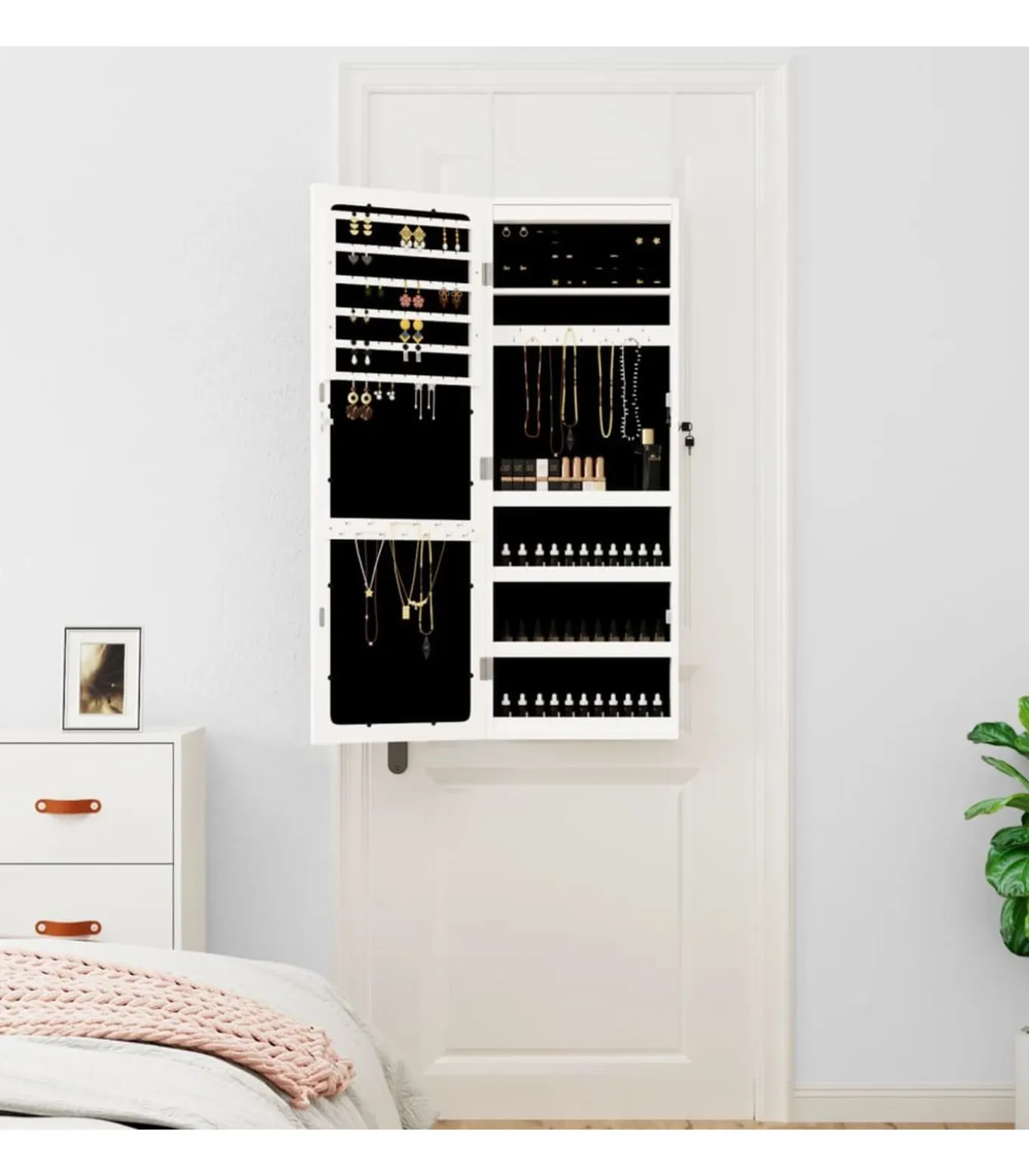 Voldoende opbergruimte: de spiegel met opbergruimte heeft veel haakjes, hangers en plankjes om je sieraden netjes geordend en binnen handbereik te houden.