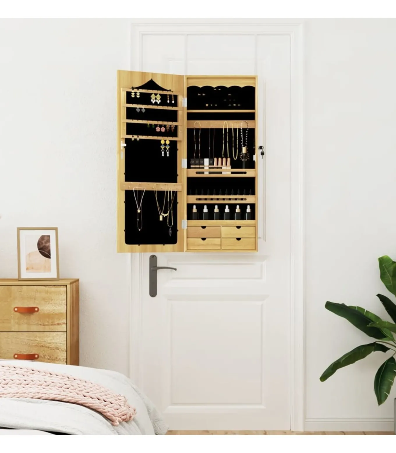 Ruimtebesparend ontwerp: hang de sieradenspiegel met de inbegrepen haken over de deur heen of bevestig hem aan de muur om vloerruimte te besparen.