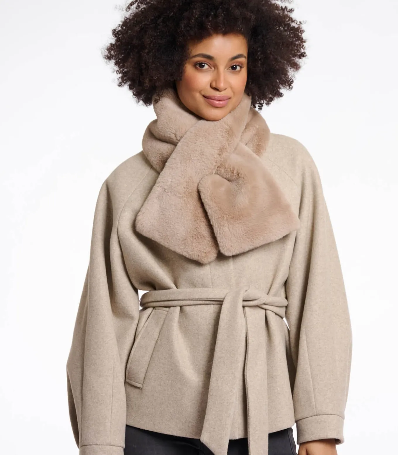 Deze superzachte sjaal van imitatiebont geeft elke look de perfecte finishing touch. Draag hem gekruist door het open detail.