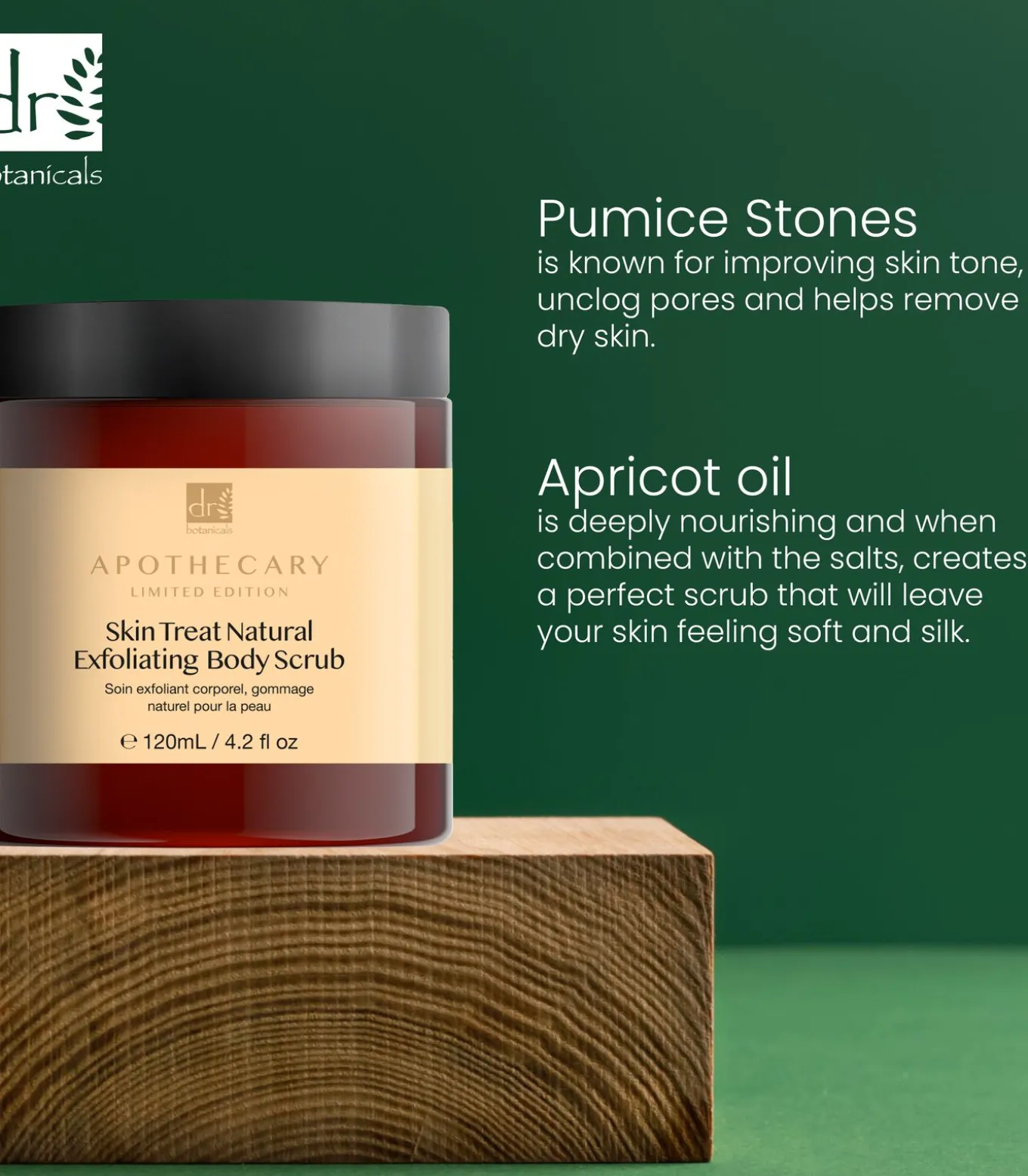 Onze Skin Treat Natural Exfoliating Body Scrub is vegan en natuurlijk. Deze luxueuze scrub verwijdert dode huidcellen en laat een zachte, gehydrateerde huid achter. Onze twee belangrijkste ingrediënten zijn Pumice Stones, die bekend staan om het verbeteren van de huidtint, het ontstoppen van poriën en het helpen verwijderen van droge huid, en Apricot Oil, die diep voedt. Wanneer gecombineerd met de zouten, creëert dit de perfecte scrub die je huid zacht en zijdezacht maakt.