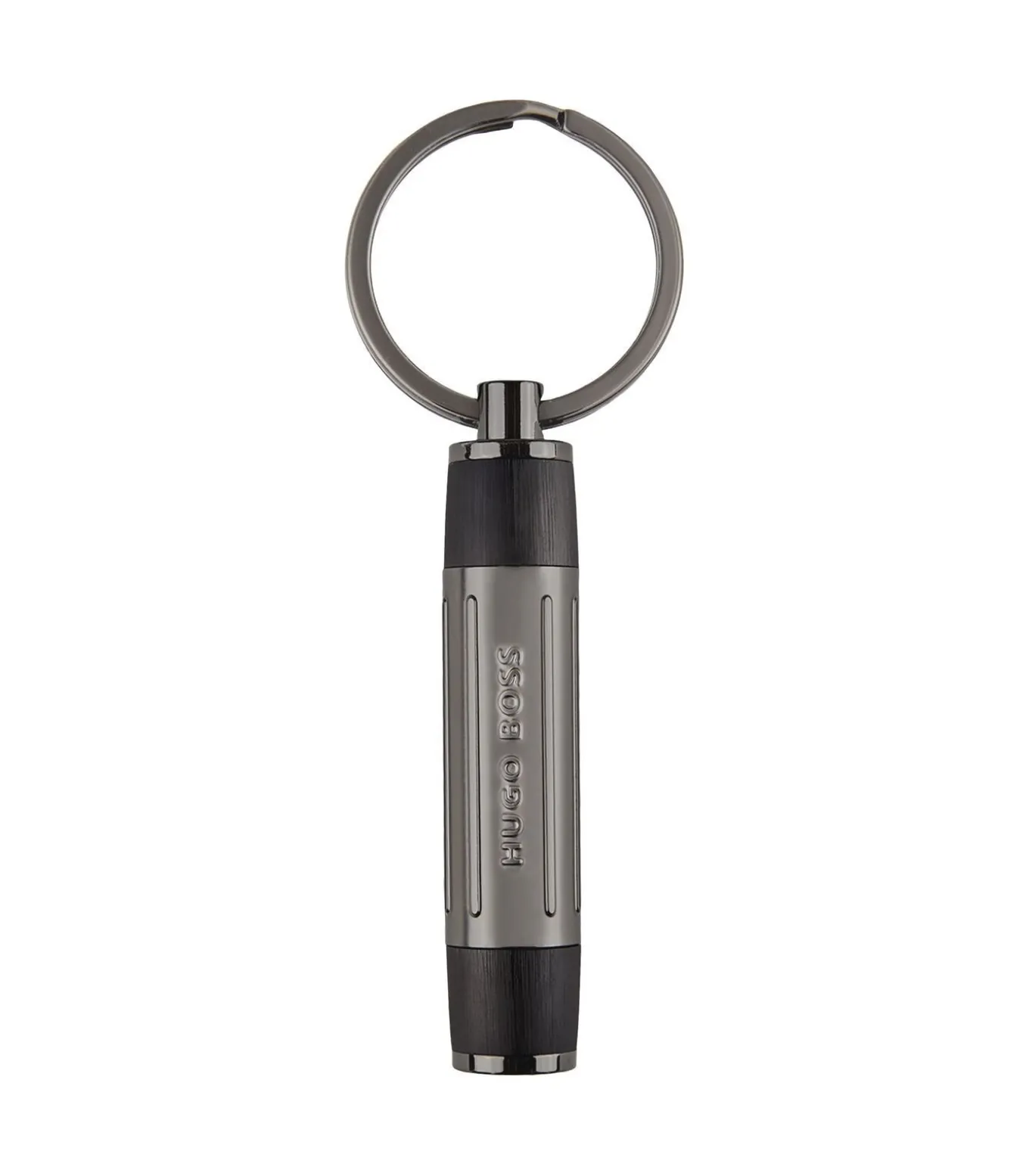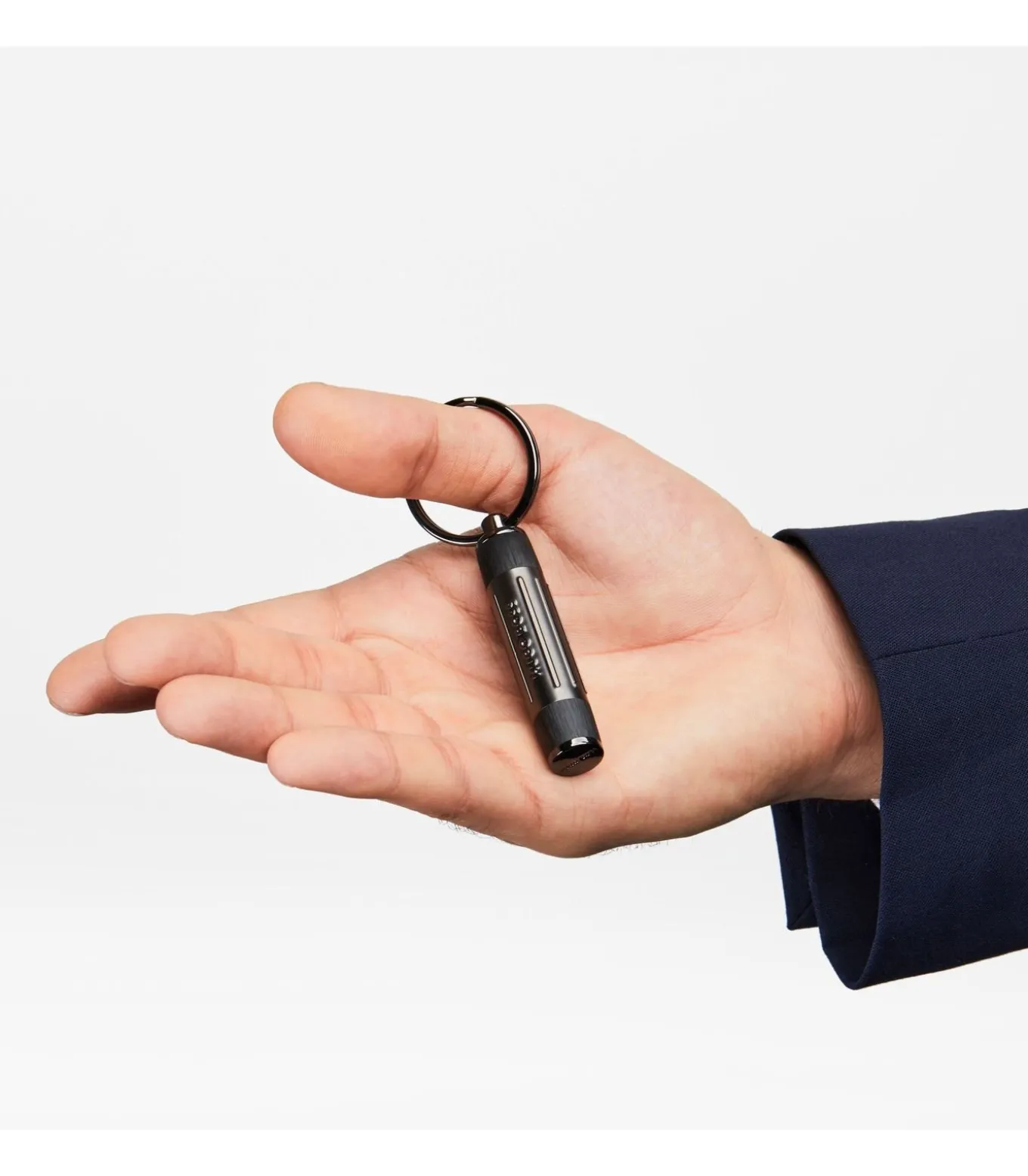 Onze nieuwe Gear ribs sleutelhanger presenteert een mix van helder geborsteld aluminium en matte metalen platings, wat de producten een futuristische en strakke uitstraling geeft. Geavanceerde machines maken de driedimensionale ribbenkast die de dop siert mogelijk, en zorgen voor een 3D–logosignatuur die subtiel en resoluut modern is. Deze versie is een mix van zwart geborsteld aluminium met subtiele pistoolaccenten. Dimensions: DIA.11 x 60/RING:28 mm, Material: 65% Brass,30% Aluminium,5% Iron