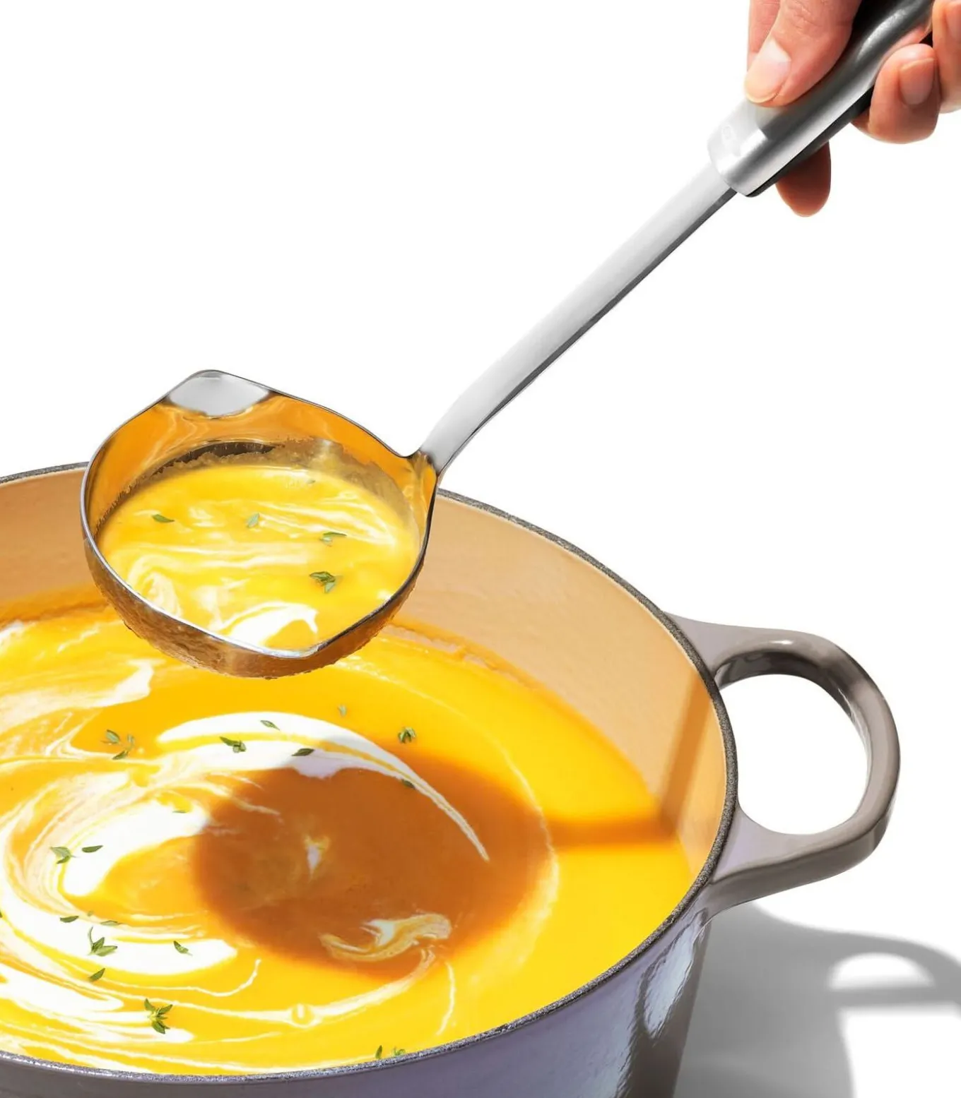 Deze soeplepel van OXO Good Grips is gemaakt van roestvrij staal. Hierdoor is de lepel erg duurzaam en klassiek. De slanke ergonomisch gevormde greep ligt comfortabel in je hand en is daarbij ook nog eens antislip. Gebruik hem in de keuken of tijdens het serveren aan tafel. Na gebruik kan deze soeplepel in de vaatwasmachine.