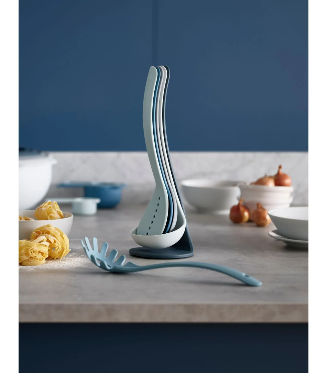 Kijk, dat is nou echt handig! Een houder met alle belangrijke keukenhulpen in één. Netjes opgeruimd en toch bij de hand. De keukenhulpen van Joseph Joseph passsen perfect in elkaar op deze houder, zodat je keukenblad netjes en opgeruimd is. De set bestaat uit: Opscheplepel Vergietlepel Soeplepel Spaghetti lepel Spatel met gaatjes Houder