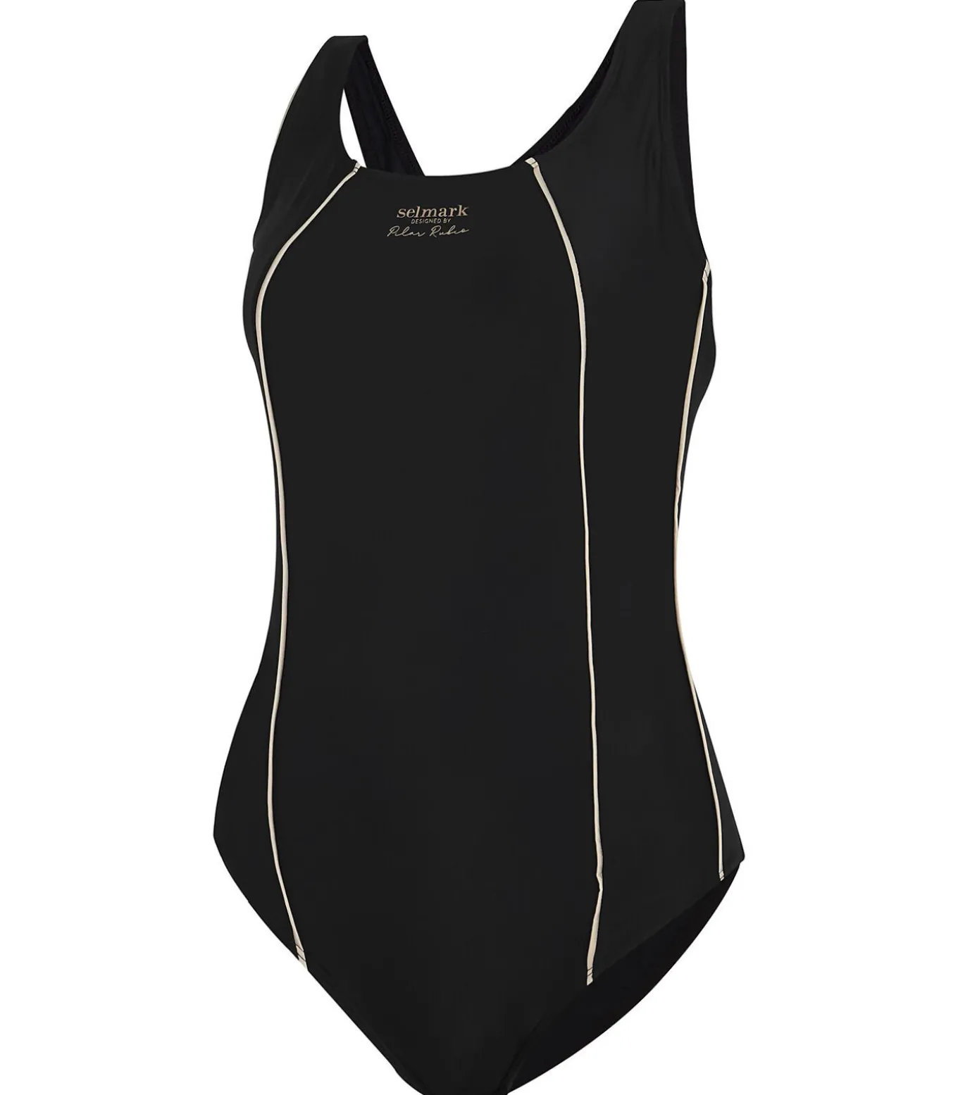 Sportief eendelig zwempak, zowel elegant als functioneel. Klassieke ronde halslijn, brede bandjes voor een goede ondersteuning. Gekruiste zwemmersrug met een ronde opening onderaan de rug voor een esthetische en sportieve touch. Samengevoegde bandjes op de rug voor ondersteuning en bewegingsvrijheid. Sober ontwerp, geschikt voor zwemmen of sport, in een speciale chloorbestendige stof. Twee verticale witte lijnen versieren elke kant van de voorkant en zorgen voor een afslankend en structurerend effect. Selmark–logo gedrukt op de bovenborst. Ideaal voor zwemmen of wateractiviteiten dankzij de ergonomische snit, het geeft je een elegante, tijdloze stijl met een vrouwelijke touch.