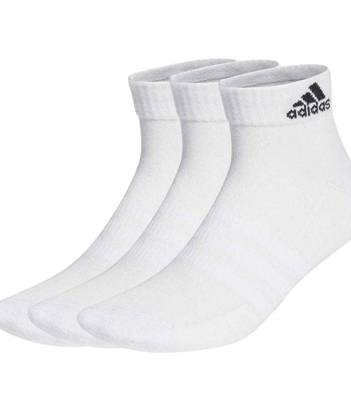 Adidas–merk kleding: sportssokken wit, gemaakt van 62% katoen, 34% hergebruikt polyester, 3% elastiek en 1% nylon. Het ontwerp is eenvoudig met het bekende logo. Het heeft een enkel snijpatroon en is gewatteerd bij de hiel en teen. De tenen zijn integraal gevormd en de naad verhoogd. De manchetten zijn elastisch en geribd om schuren te voorkomen.