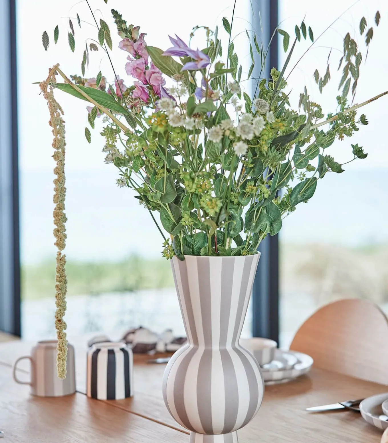 De Toppu ronde vaas is een geliefde toevoeging aan de Toppu familie en een OYOY klassieker. Handgemaakt met precisie, schildert een team van hoogopgeleide vrouwen delicaat elke streep, waarmee ze hun expertise laten zien. Hetzelfde toegewijde team maakt alle Toppu artikelen, zodat je verzekerd bent van consistent vakmanschap. Het doordachte ontwerp van de vaas voegt niet alleen een vleugje elegantie toe, maar zorgt er ook voor dat bloemen mooi staan, waardoor het een perfecte mix is van vorm en functie.
