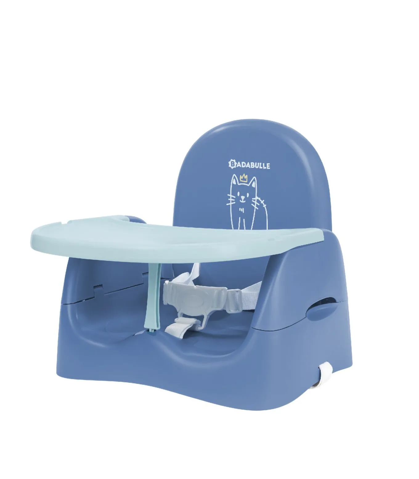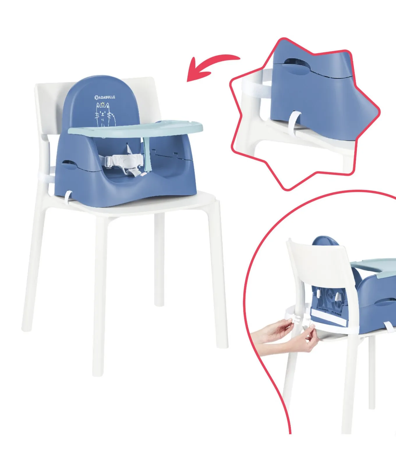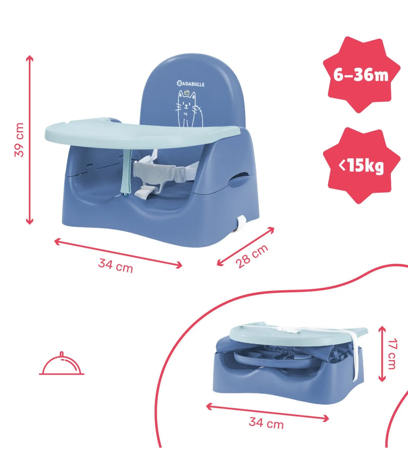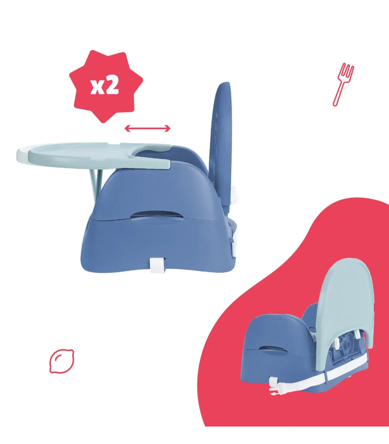 Gemakkelijk op te bergen en ultracompact opvouwbaar Past op alle soorten stoelen Groot verstelbaar maaltijdblad (2 posities) en verwijderbaar voor opslag op de rugleuning van de stoel 3–punts veiligheidsgordel Eenvoudig te installeren en te bevestigen: 1 riem voor de zitting en 1 voor de rugleuning Schaalbaar, verandert in een kleine fauteuil Gemakkelijk mee te nemen (schouderriem inbegrepen) Gemaakt van gerecycled plastic Levenslange garantie