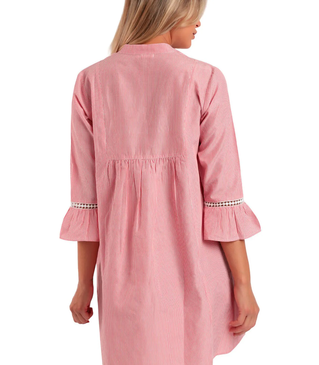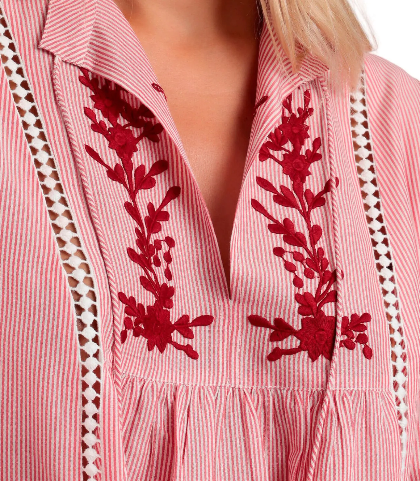 Zomerse tuniek in een comfortabele, draagbare snit, gemaakt van lichtgewicht katoen dat zacht aanvoelt en fijn gestreept is. Perfect voor warme zomerdagen in de stad of op het strand. De tuniek heeft fijne inzetstukken van lint aan de voorkant in een originele, romantische gehaakte stijl. Deze inzetstukken versieren ook de driekwartmouwen, die aan de uiteinden zijn gerimpeld voor een nog luchtigere, vloeiendere touch. De V–hals is afgezet met prachtig bloemenborduursel en geaccentueerd met fijne plooitjes. De kraag heeft bandjes met kwastjes die je kunt vastknopen of los kunt laten, afhankelijk van je stijlvoorkeuren.[Tuniek afzonderlijk verkrijgbaar. Sieraden en andere accessoires die het model op de foto’s draagt, zijn niet inbegrepen].