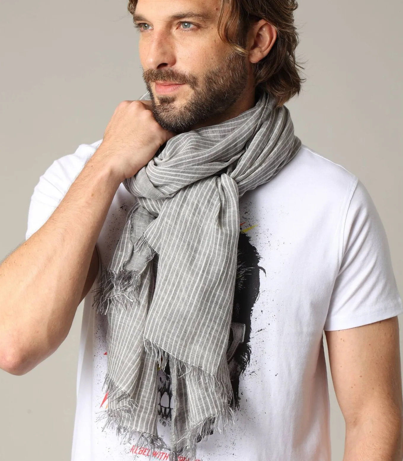 Katoenen sjaal (samenstelling: 50% katoen, 50% polyester) Grijs met fijne witte strepen Als je van accessoires houdt die zowel nuttig als trendy zijn, dan zul je de SUBWAY sjaal geweldig vinden. In de lente/zomer houden we er erg van om te beschermen tegen de wind en om dynamiek aan een outfit toe te voegen.SUBWAY is gemaakt van een mix van katoen en polyester. Het voelt heel zacht aan, is licht en ademend. Met zijn discrete patroon van fijne witte strepen op een grijze achtergrond voegt deze sjaal een vleugje elegantie toe aan je dagelijkse outfit. Om om de nek of op de schouders te dragen.