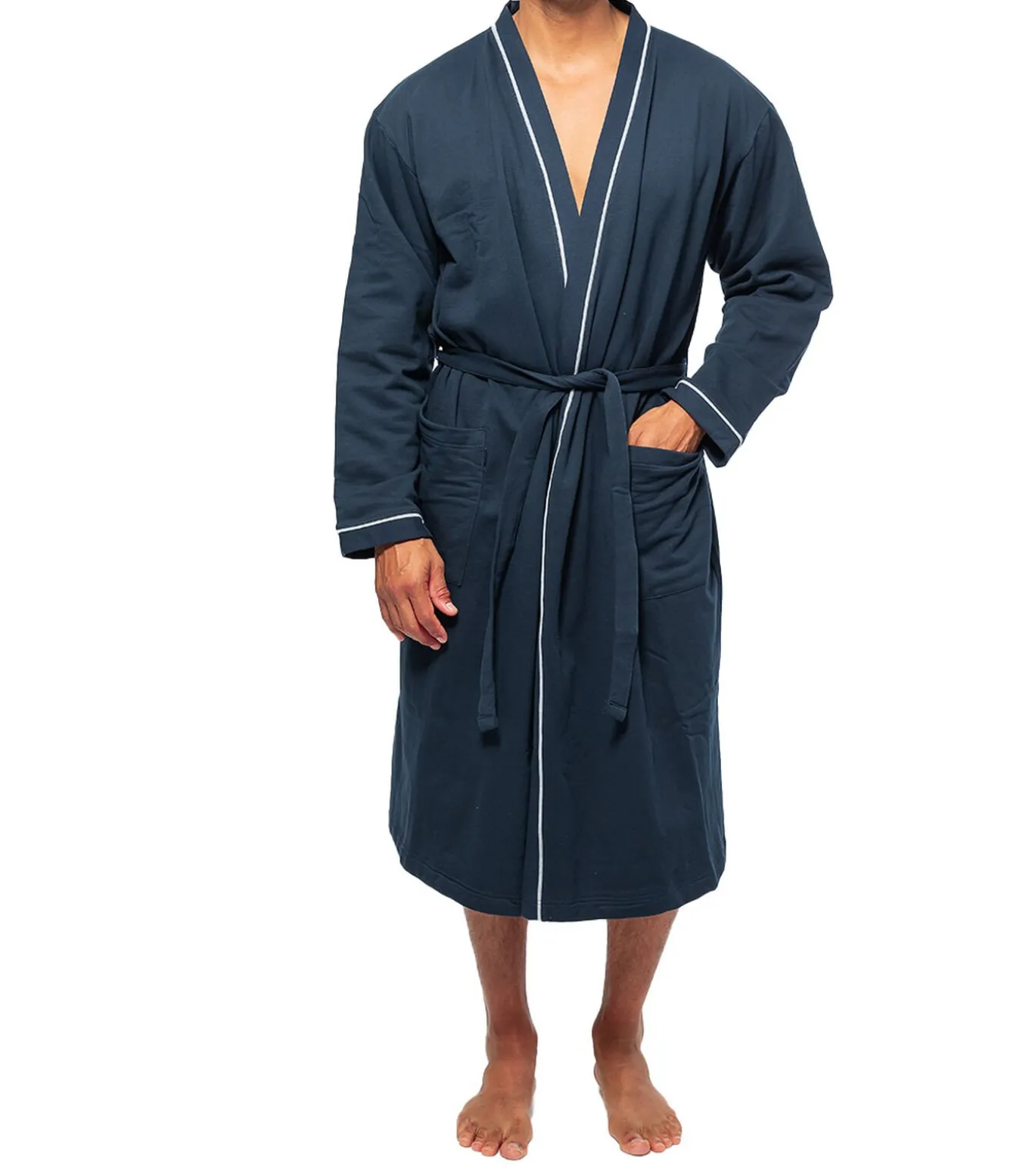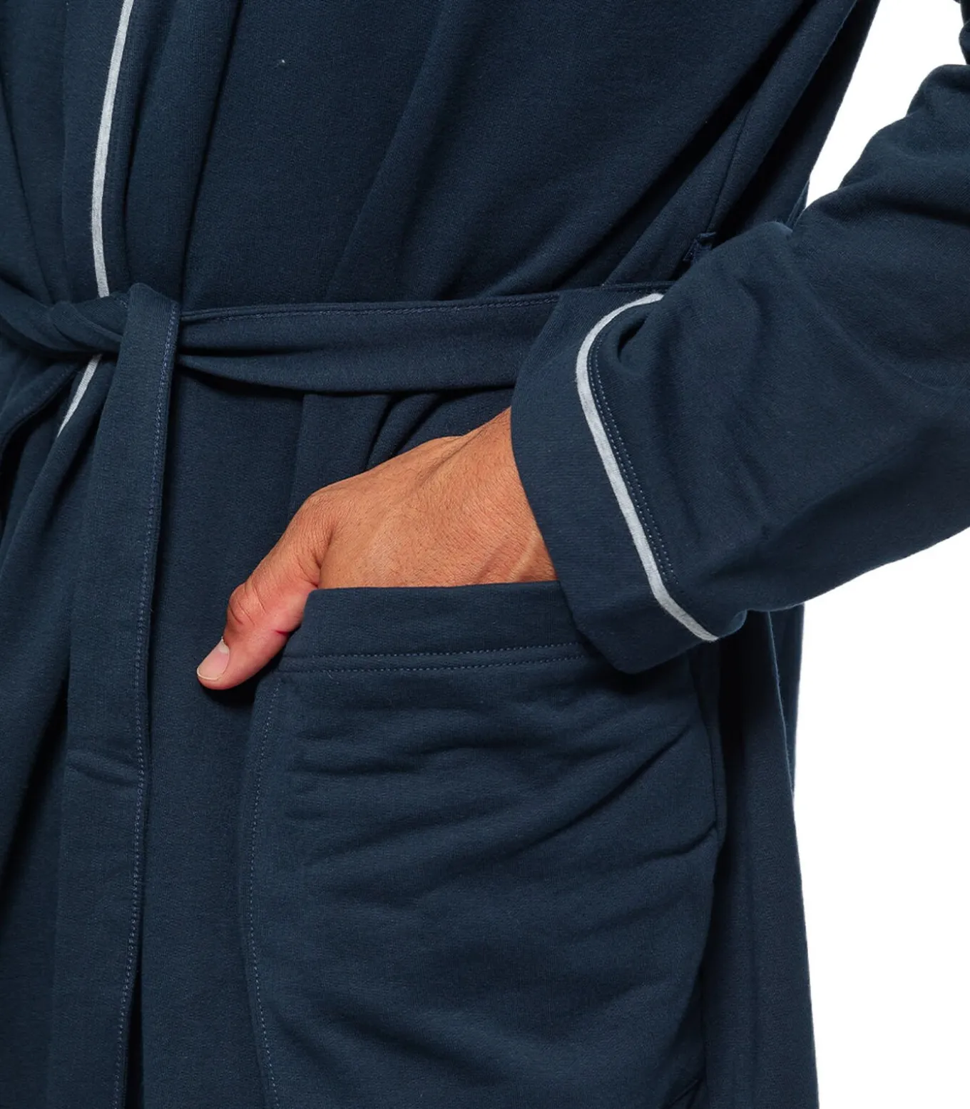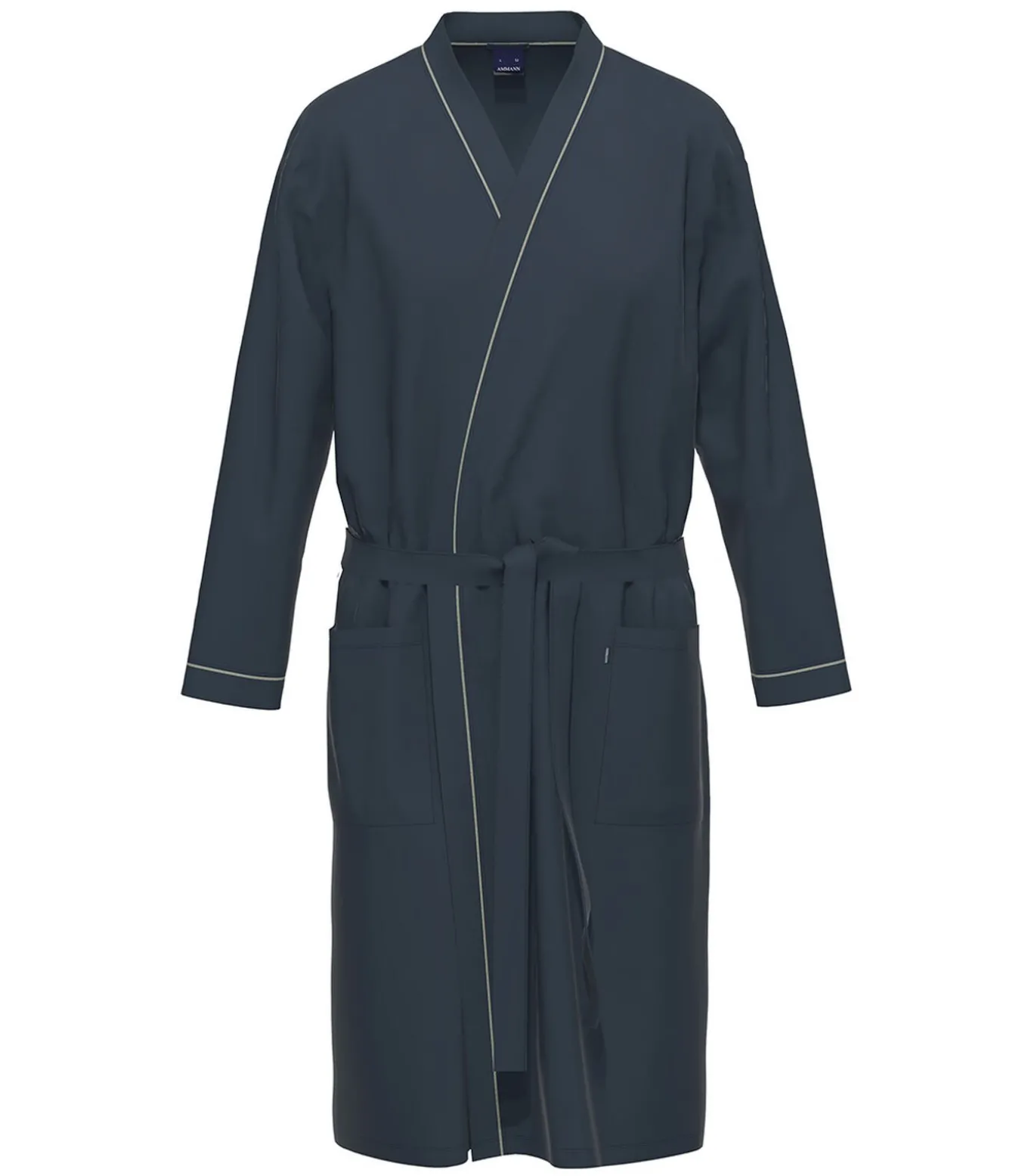 Deze zachte ochtendjas van 100% organic katoen is het lichte alternatief voor de klassieke badjas. Hij is heerlijk licht en plat opvouwbaar, zodat hij ook de perfecte reisgezel is. Zijzakken en gestreepte boorden zijn modieuze details.