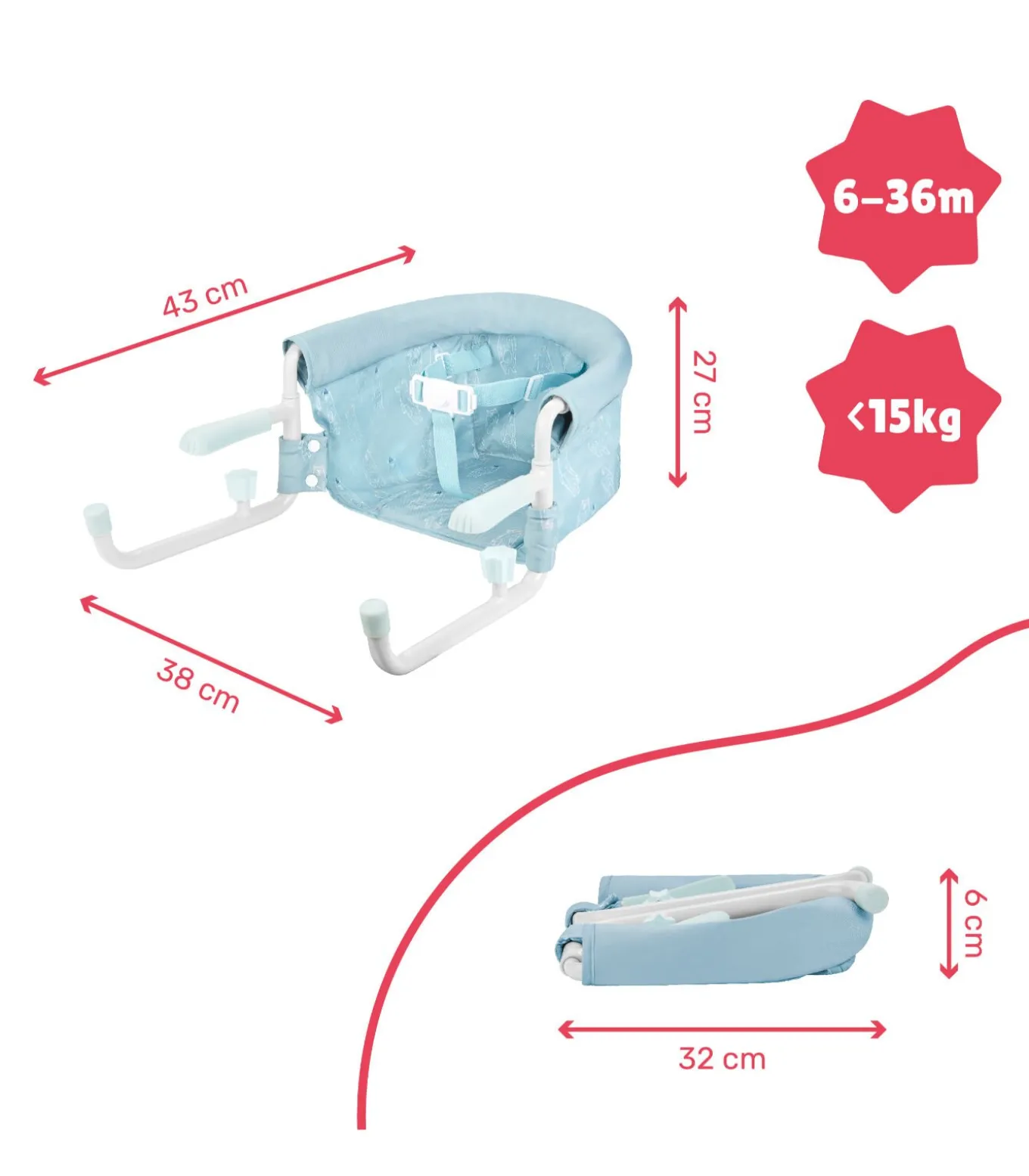 Uiterst stabiel bevestigingssysteem met 4 armen, aanpasbaar aan tafels van 20 mm tot 53 mm dik Ultracompact en licht, eenvoudig op te vouwen 3–punts veiligheidsgordel In hoogte verstelbaar: 3 standen Opbergvak op de rugleuning Machinewasbaar (30°)