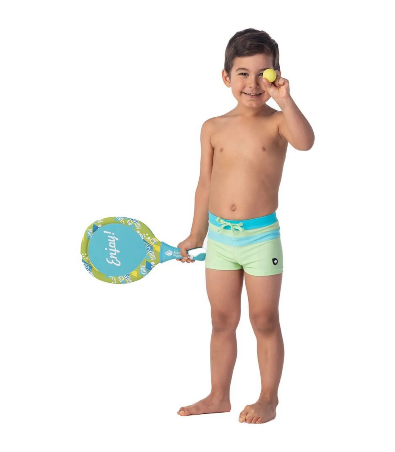 Deze Aquawave zwemshort voor kinderen heeft een stretch polyester voering en chloorbestendige, UV–beschermende stof. Het contrasterende streepdessin is voorzien van paneeldetails met een trekkoordsluiting in de taille en een elastische brede tailleband voor een goede pasvorm. De materiaalmix van elastaan, nylon en polyester is gecertificeerd door Oeko–Tex voor duurzaamheid.