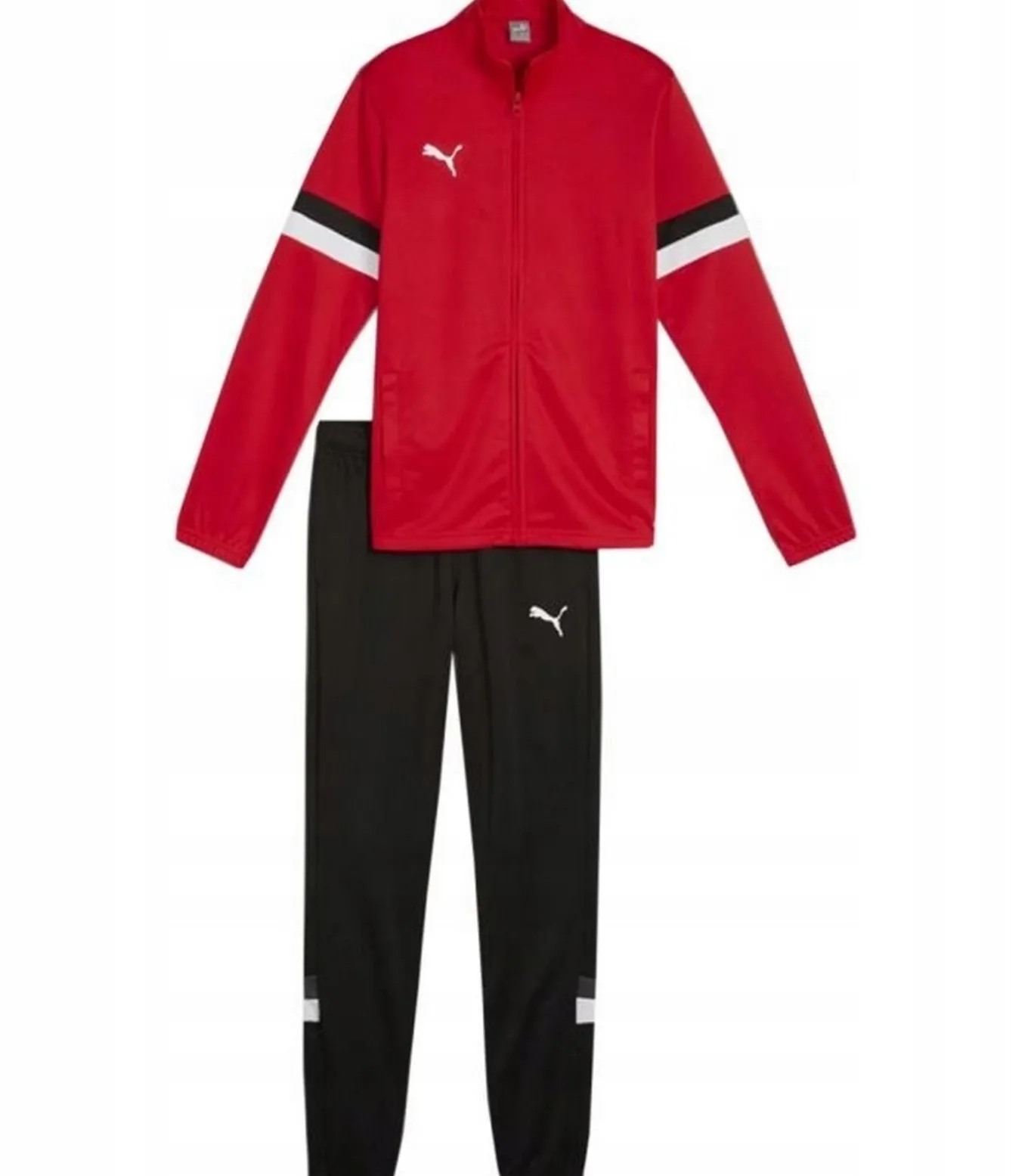 Puma Team Rise trainingspak rood is een product van de internationale merknaam Puma en bestaat geheel uit polyester. Het ontwerp van dit trainingspak wordt gedomineerd door een duidelijk embleem en een stripedig detail. Het pak beschikt over twee zijzakken, twee onderzakken, omslag– en ritssluitingen en elastieke manchettes en waistline. Verder heeft het trainingspak lange mouwen en een staande kraaghalslijn, snel droogende stoftechnologie, een trekkoord– en riitssluiting en trim detail. In de verkoop bevindt zich één broekje en één jasje. Dit trainingspak is geschikt voor reguliere gebruik en voor training en komt in verschillende grootten voor: 25 inch voor leerlingen van 5 tot 6 jaar, 27,5 inch voor kinderen van 7 tot 8 jaar, 30 inch voor kinderen van 9 tot 10 jaar, en 36 inch voor kinderen tussen de leeftijd van 11 en 14 jaar.
