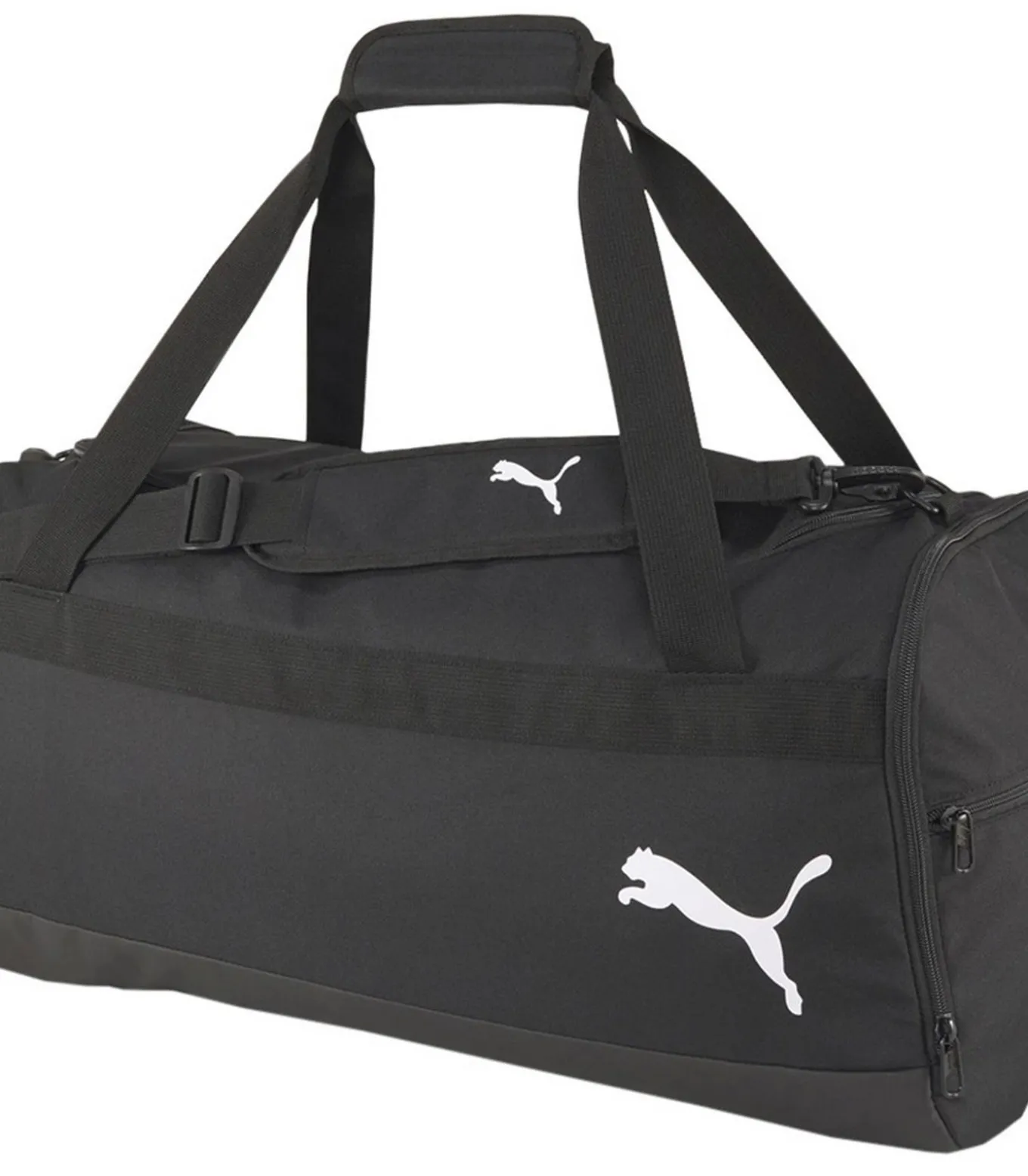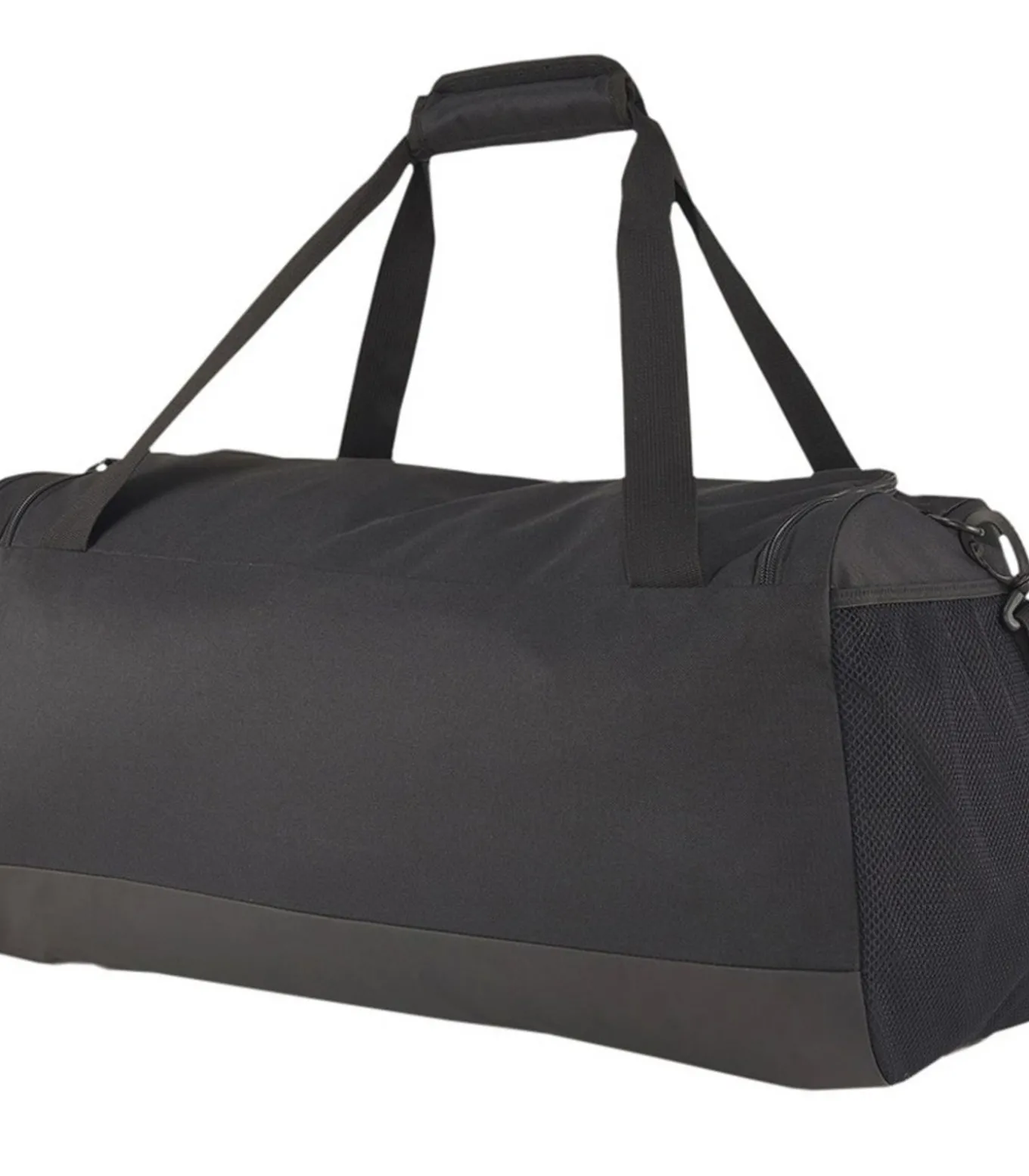 Puma’s TEAMGOAL 23 – Zwarte Plunjezak: Deze ruimteverende zak is van 100% polyester gemaakt, met een capaciteit van 54L. De zak beschikt over twee zijzakken, een rits en een gaaszak. Het heeft één hoofdcompartiment en is verstelbaar met een sterke basis en een draaggreep uit geweven band, evenals een schouderriem in hetzelfde materiaal. Het ontwerp van deze zak is simpel met het Puma–logo. De zak wordt met een tweewegrits vastgehouden.