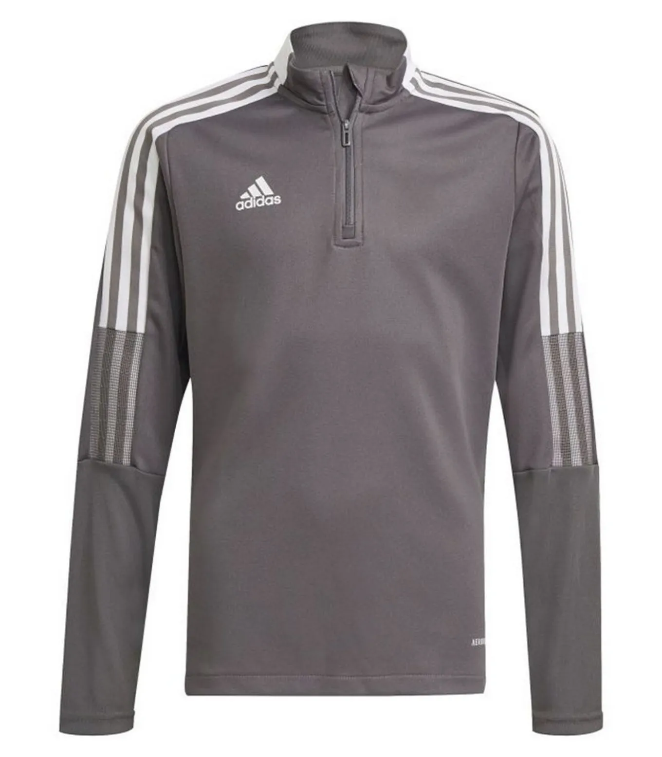 Adidas TIRO 21–sweatshirt in grijs is gemaakt van polyester en heeft een vezel– en primegroene oppervlakte. Het ontwerp kenmerkt zich door het Adidas logo en zijstreep, met aeroready stoftechnologie voor maximale comfortabele thermische eigenschappen. Deze pull over heeft lange mouwen, een staande kraaghalslijn en een kwartrits sluiting. Het product heeft ook een zijsplit om optimaliseren van de bewegelijkheid.
