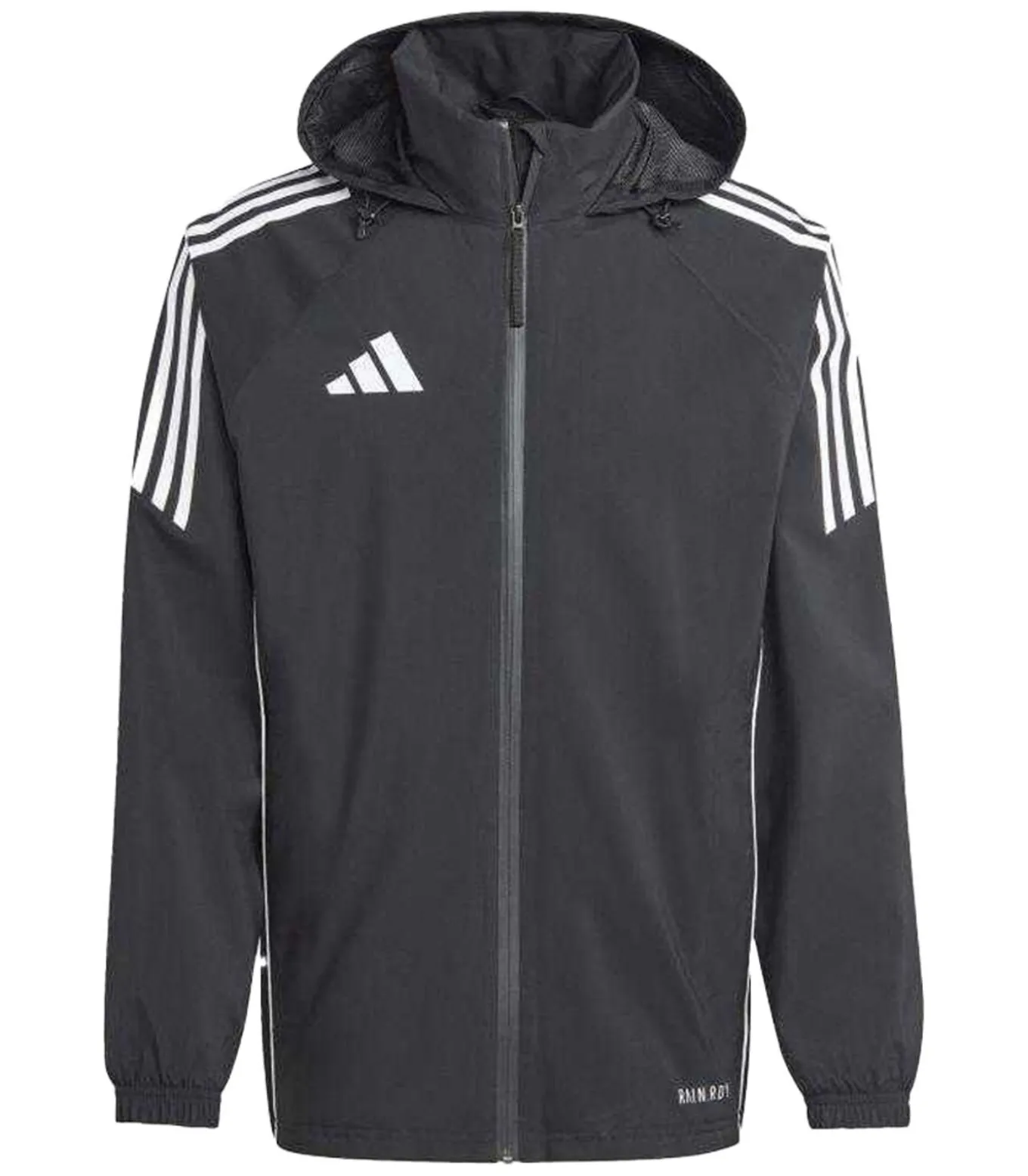 Adidas TIRO 24 zwart jasje gemaakt van 100% polyester. Het ontwerp bevat een netwerkvoering en is zacht. Het heeft de Regen.RDY stoftechnologie, elastiek manchetten met lange mouwen, vastgemaakte naadloze naden, een staande kraaghals en een kap met bungeekoord dat afneembaar is en opgenaaid is. Het wordt regelmatig aangeboden en heeft een volledige ritssluiting. Sizetallen: 36 in, 39 in, 42,5 in (XL), 46,5 in (XL) en 51 in (XXL).