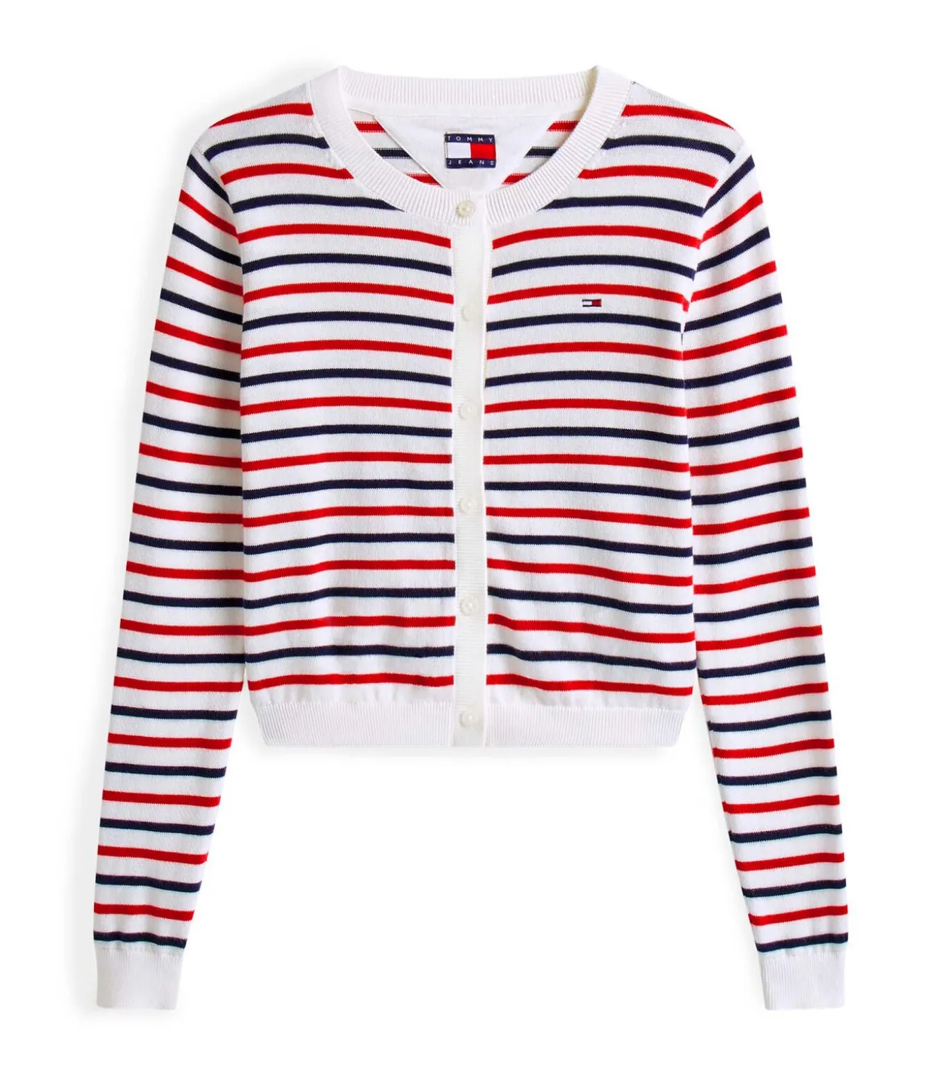 Kleur: Wit / Rood / Marineblauw gestreept. Samenstelling: 100% katoen. Mouwen: Lang. Halslijn: Ronde hals. Pasvorm: Slim fit. Sluiting: Knoopjes. Details: Gebreide, geribbelde kraag, manchetten en zoom, geborduurd logo op de borst. Gebruik: Elegant en veelzijdig vest, perfect om over een T–shirt of overhemd te dragen voor een casual maar verfijnde look.