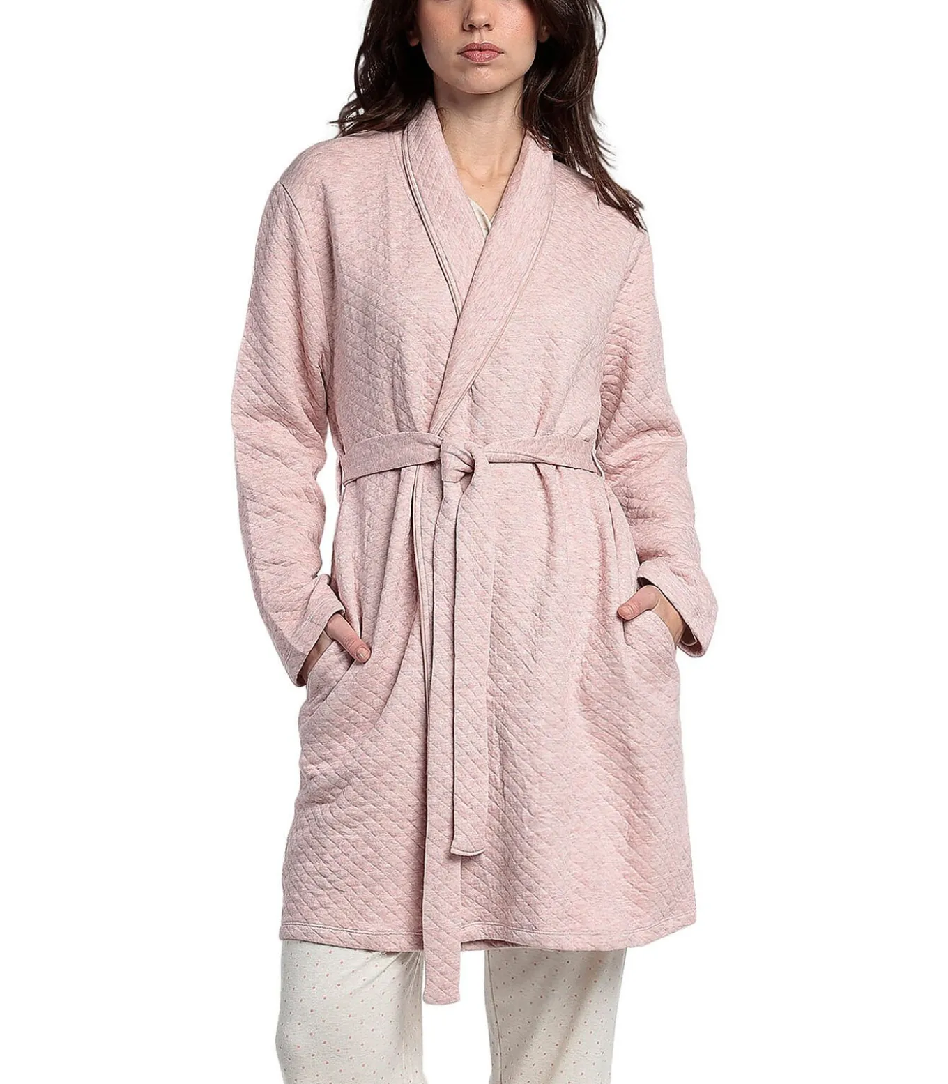 Een knusse, vrouwelijke en elegante badjas voor ontspannen momenten thuis. Het heeft lange mouwen en een brede, zachte sjaalkraag voor een vleugje verfijning. Strikceintuur in de taille om naar wens aan te passen. Half katoen, half viscose gewatteerde stof met honingraateffect die reliëf geeft met behoud van soepelheid en comfort, een combinatie van warmte en ademend vermogen. De delicate, rustgevende kleur is perfect voor een cocooning, vrouwelijke look. Twee praktische, discrete zijzakken. Ideaal voor winterochtenden, ontspannen avonden of om gewoon aan te trekken als je opstaat. Zachte, sobere en verfijnde look, ideaal voor vrouwen die op zoek zijn naar een lichte maar omhullende badjas. Geleverd in een Admas doos.[Badjas wordt apart verkocht. Pyjama’s en andere accessoires die het model op de foto’s draagt, zijn niet inbegrepen].
